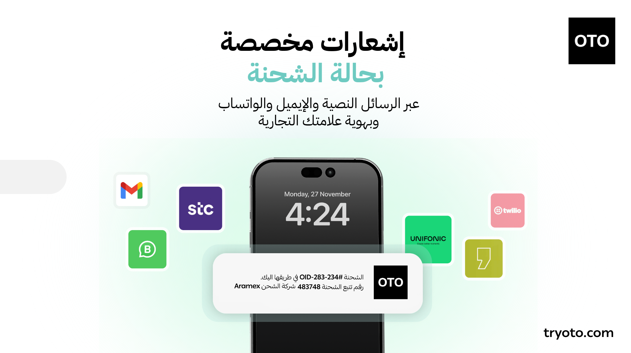 • إشعارات مُخصصة للعملاء حول جميع مراحل الطلب بالرسائل النصية، البريد الإلكتروني، والواتساب، وبهويتك التجارية