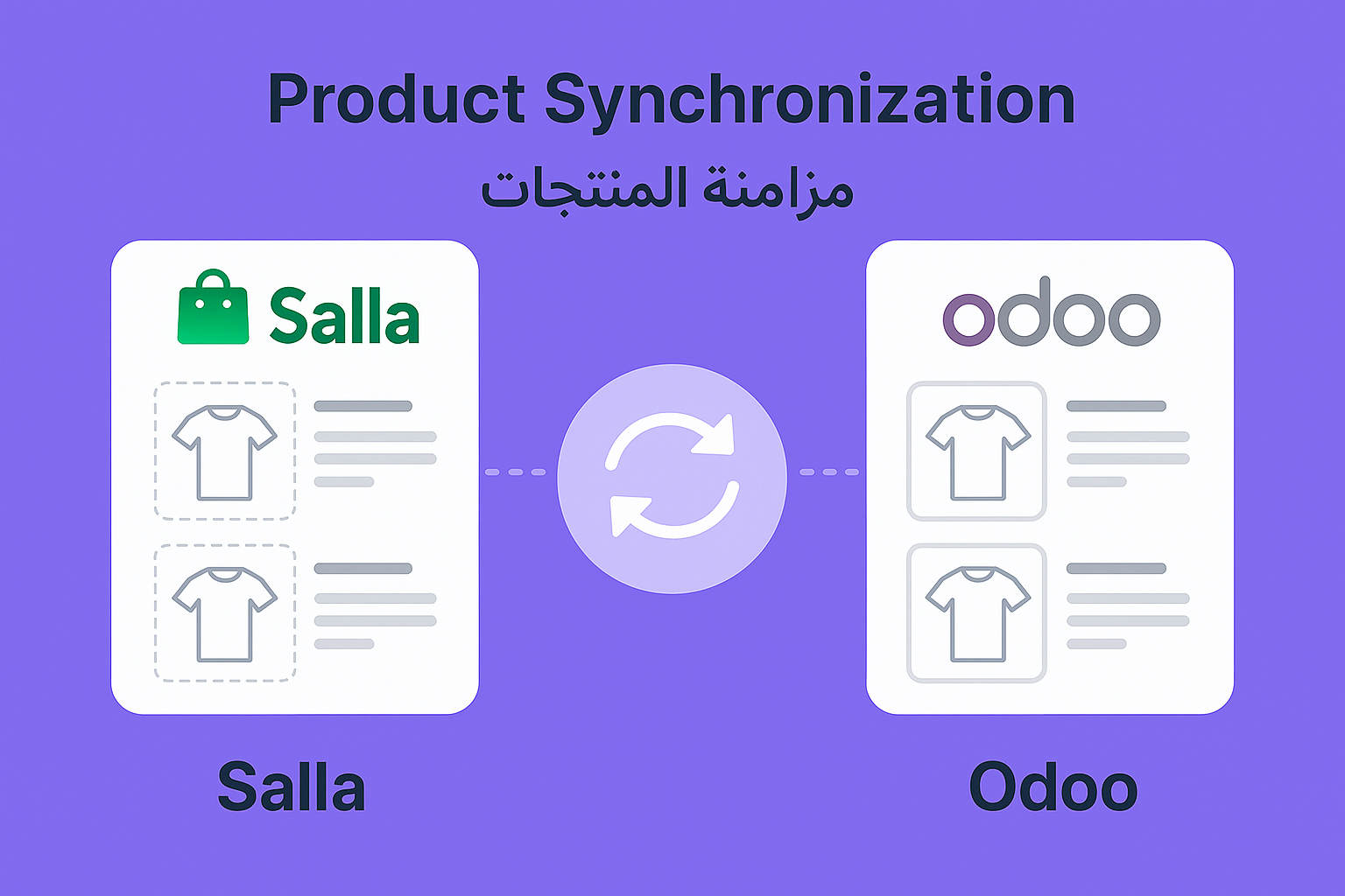 • مزامنة تلقائية للمنتجات بما في ذلك الاسم، السعر، الكمية، الصور وغيرها من التفاصيل بين سلة وOdoo ERP