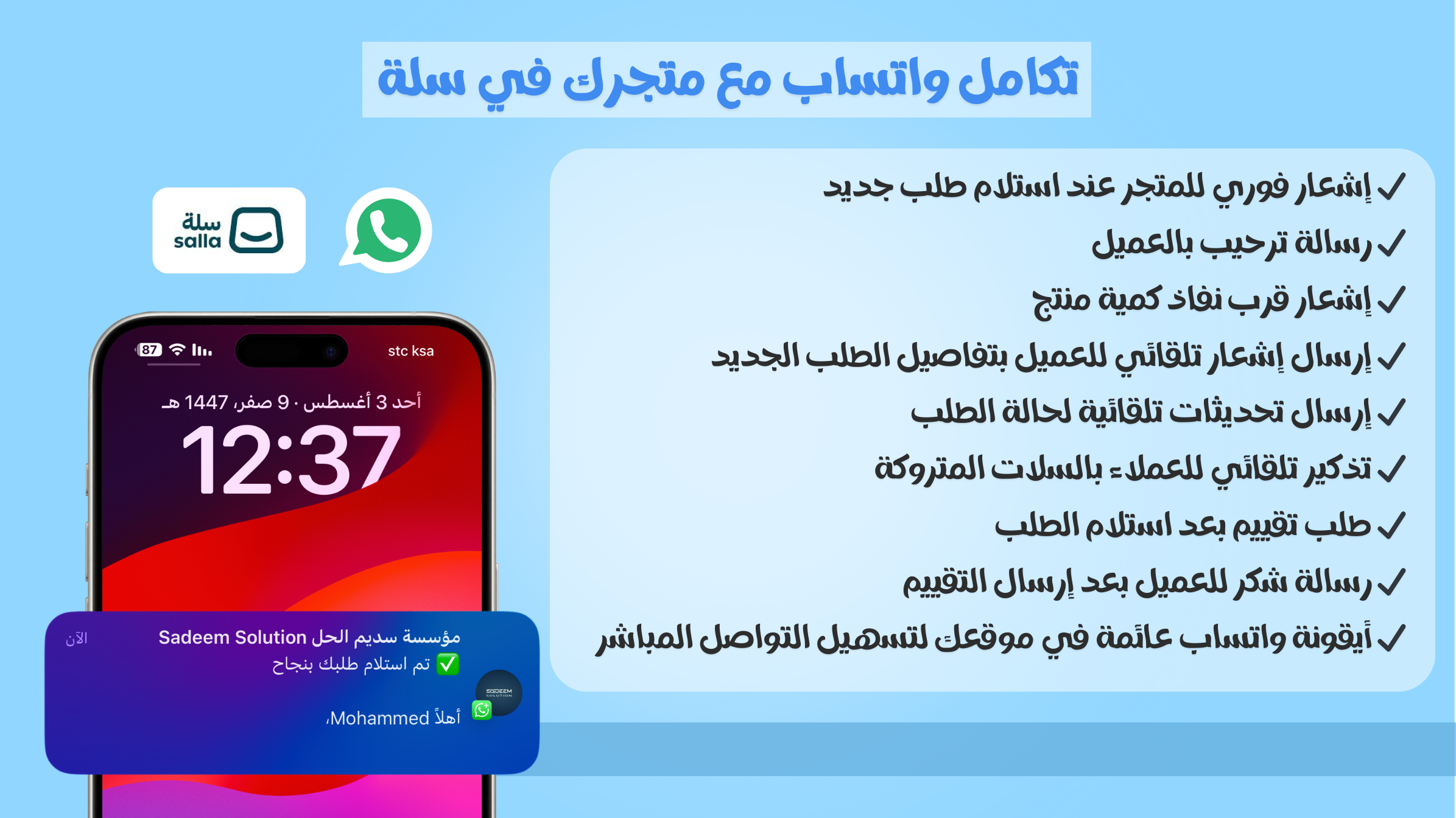 - إشعارات فورية عبر واتساب لجميع مراحل الطلب دون تدخل يدوي