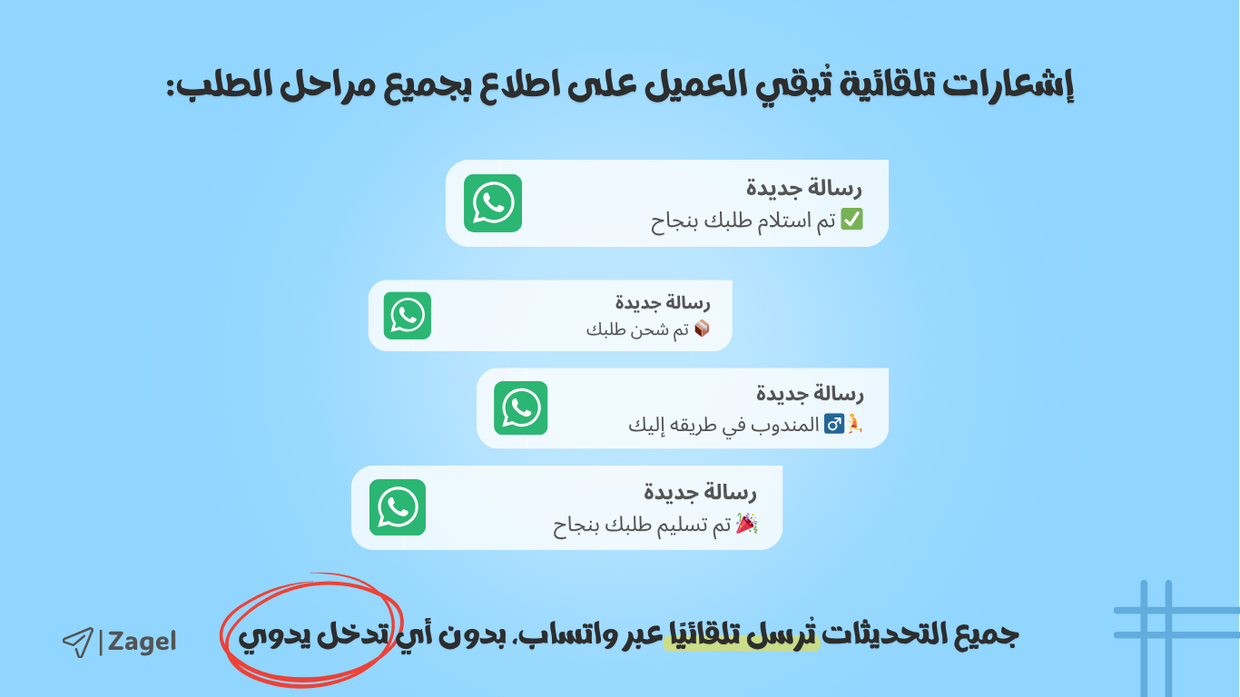 جميع الإشعارات والرسائل تعمل تلقائيًا دون الحاجة إلى متابعة أو إعادة ضبط مستمرة، ما يجعل الزاجل مناسبًا حتى للمتاجر التي ليس لديها خبرة تقنية متقدمة.