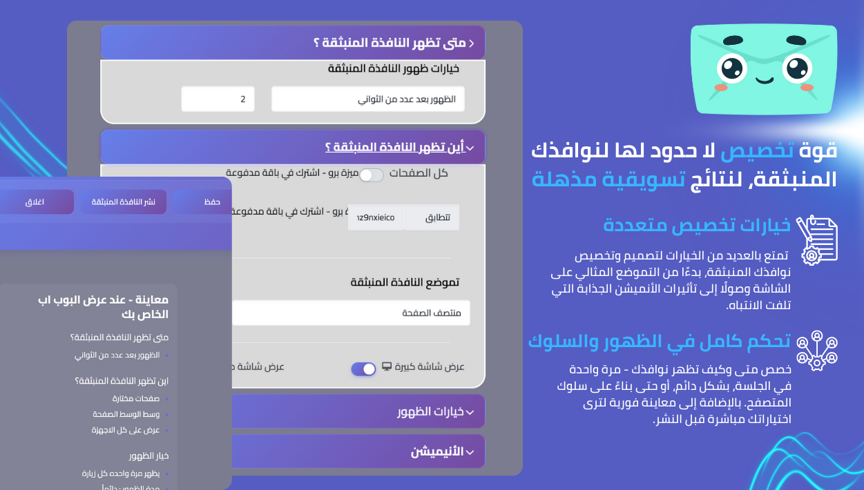 - إمكانية التحكم في توقيت ومكان النوافذ المنبثقة بدقة متناهية