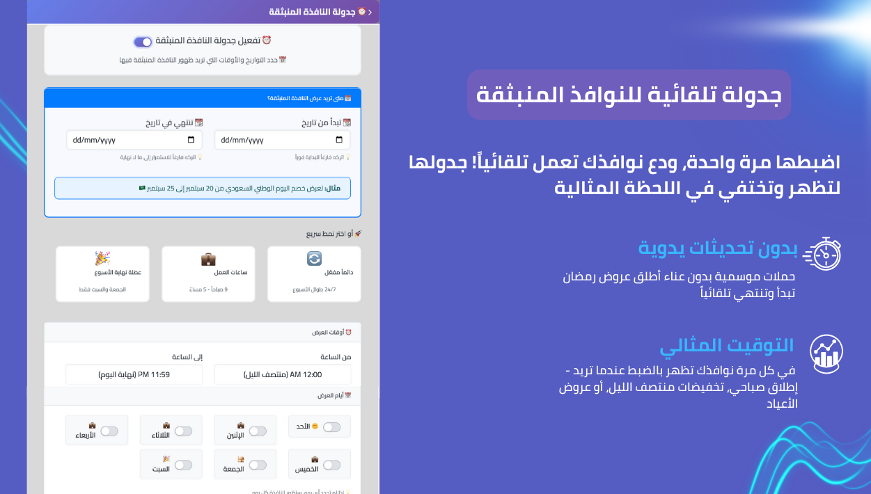 - استهداف ذكي للنوافذ حسب الصفحة أو نوع الزائر أو الموقع الجغرافي