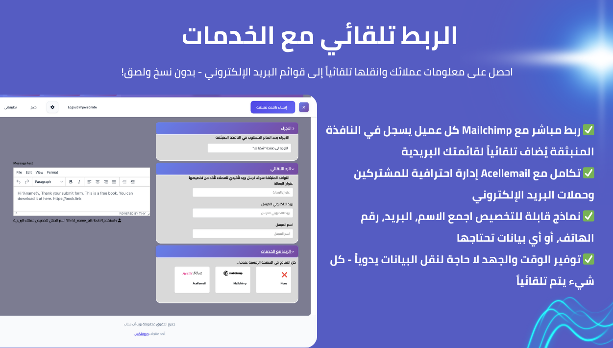 - تكاملات جاهزة مع خدمات MailChimp، كانفا، واتساب وتصدير البيانات لـ Excel/CSV