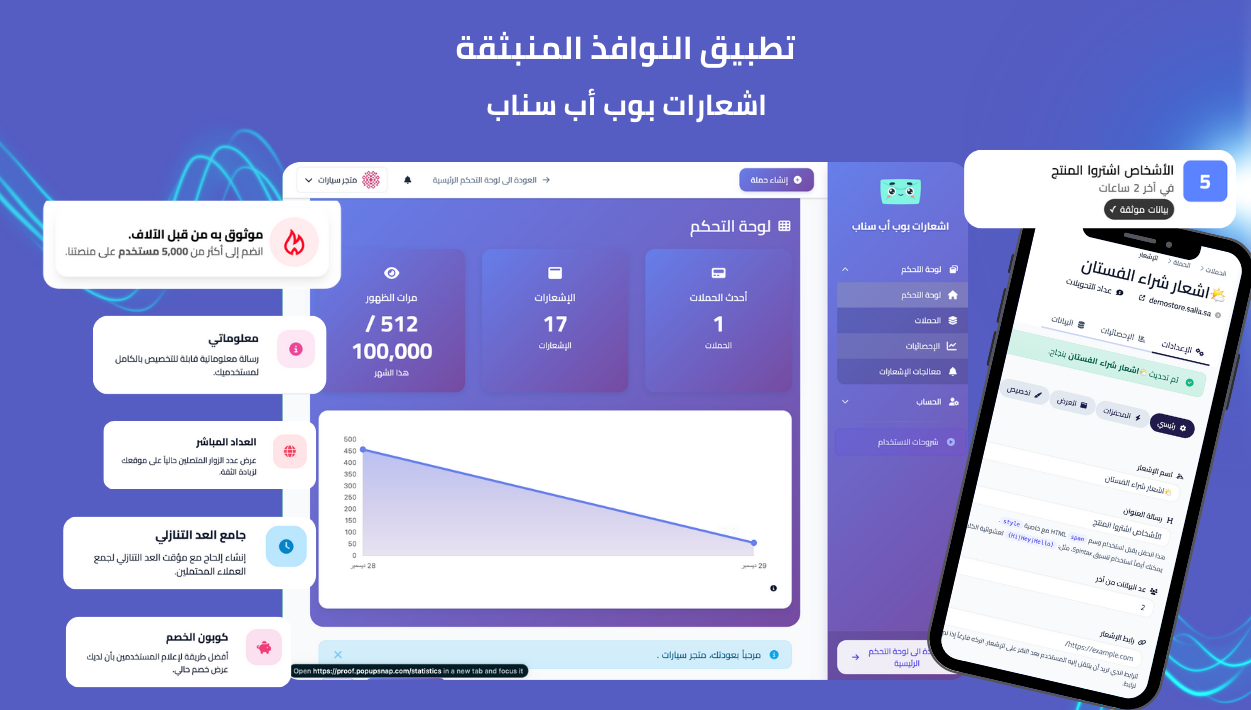 - توفير أكثر من 50 نمط إشعارات تفاعلية تخدم أغراض تسويقية متنوعة