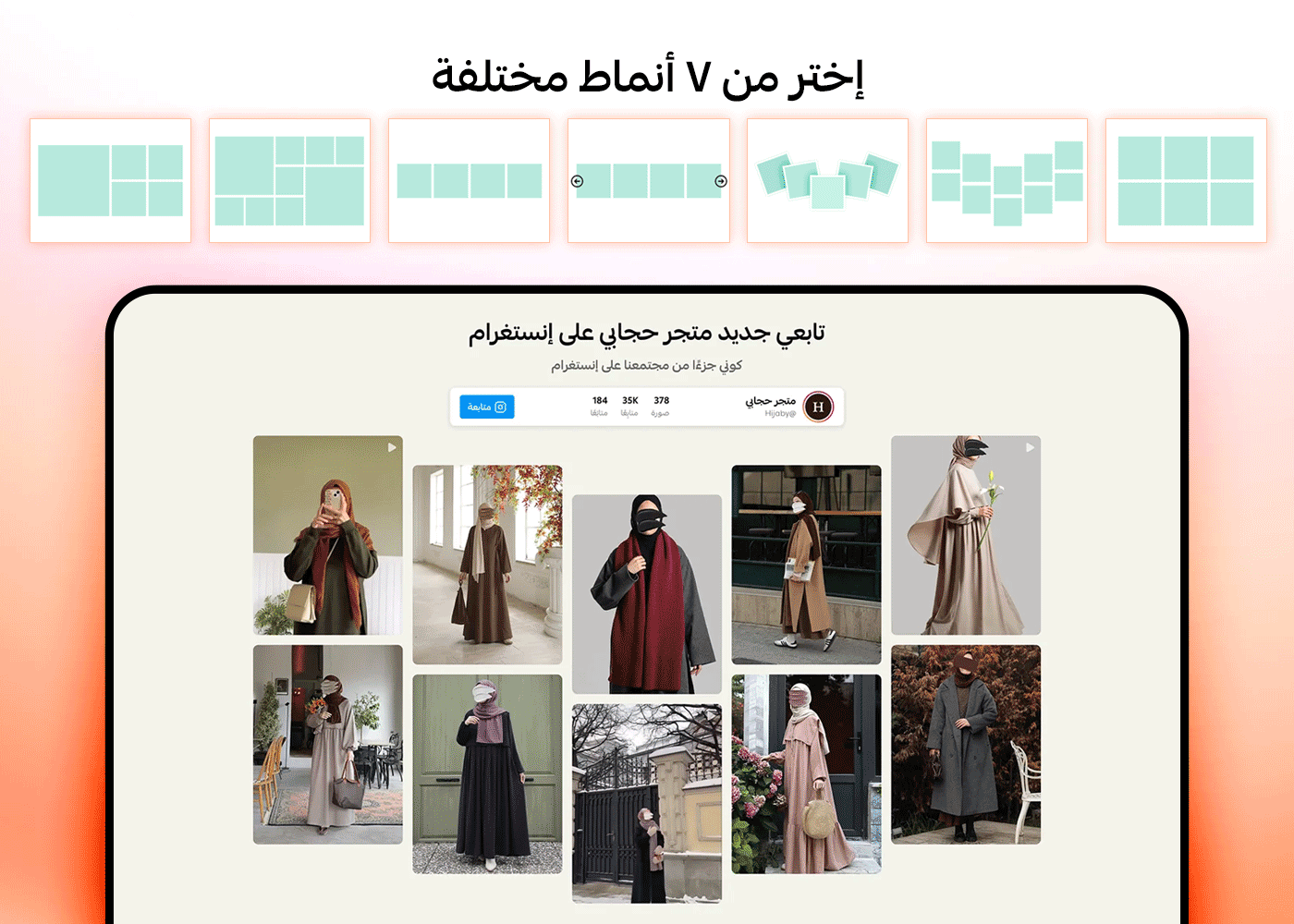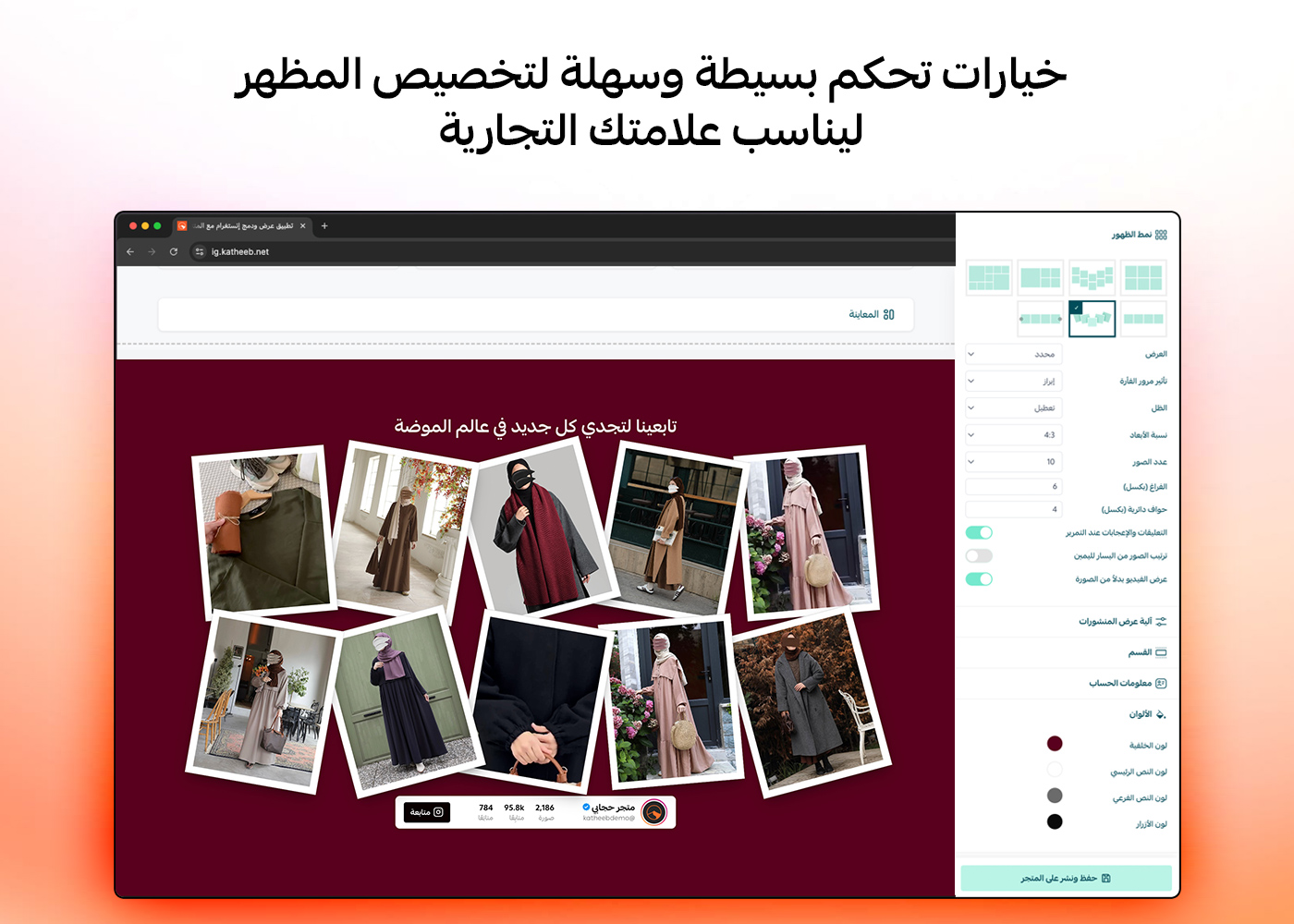 يوفر تطبيق “انستاكارت” حرية واسعة لتصميم القسم الخاص بمنشورات إنستغرام داخل متجرك على سلة. يمكن للتاجر اختيار أحد التصاميم السبعة المتاحة بما يتناسب مع ذوقه وهويته التجارية. كما يمكن تخصيص الألوان، الخطوط، والتأثيرات ليظهر القسم بشكل متناسق مع تصميم وهوية المتجر، مما يوحي بالاحترافية والاهتمام بالتفاصيل.