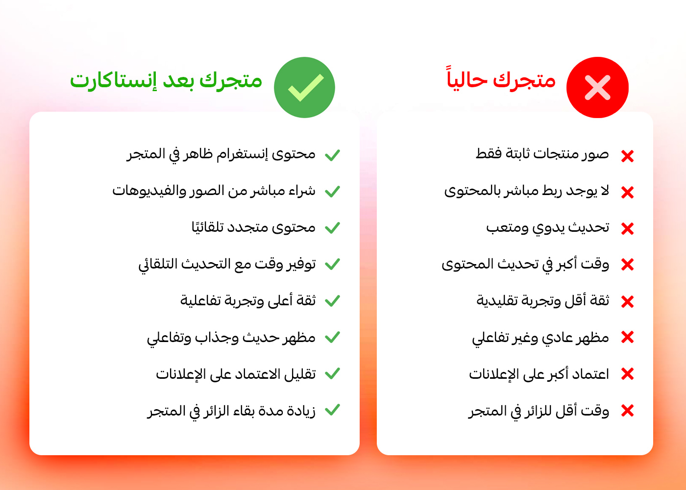 بحلول “انستاكارت”، يتم استثمار محتوى إنستغرام بشكل مباشر في تعزيز تجربة التسوق، حيث يرى الزائر كل جديد لديك على إنستغرام ويستطيع التعرف على المنتجات وشرائها بسهولة دون الحاجة للخروج من موقع المتجر، وكل ذلك يحدث بشكل تلقائي ومنظم.