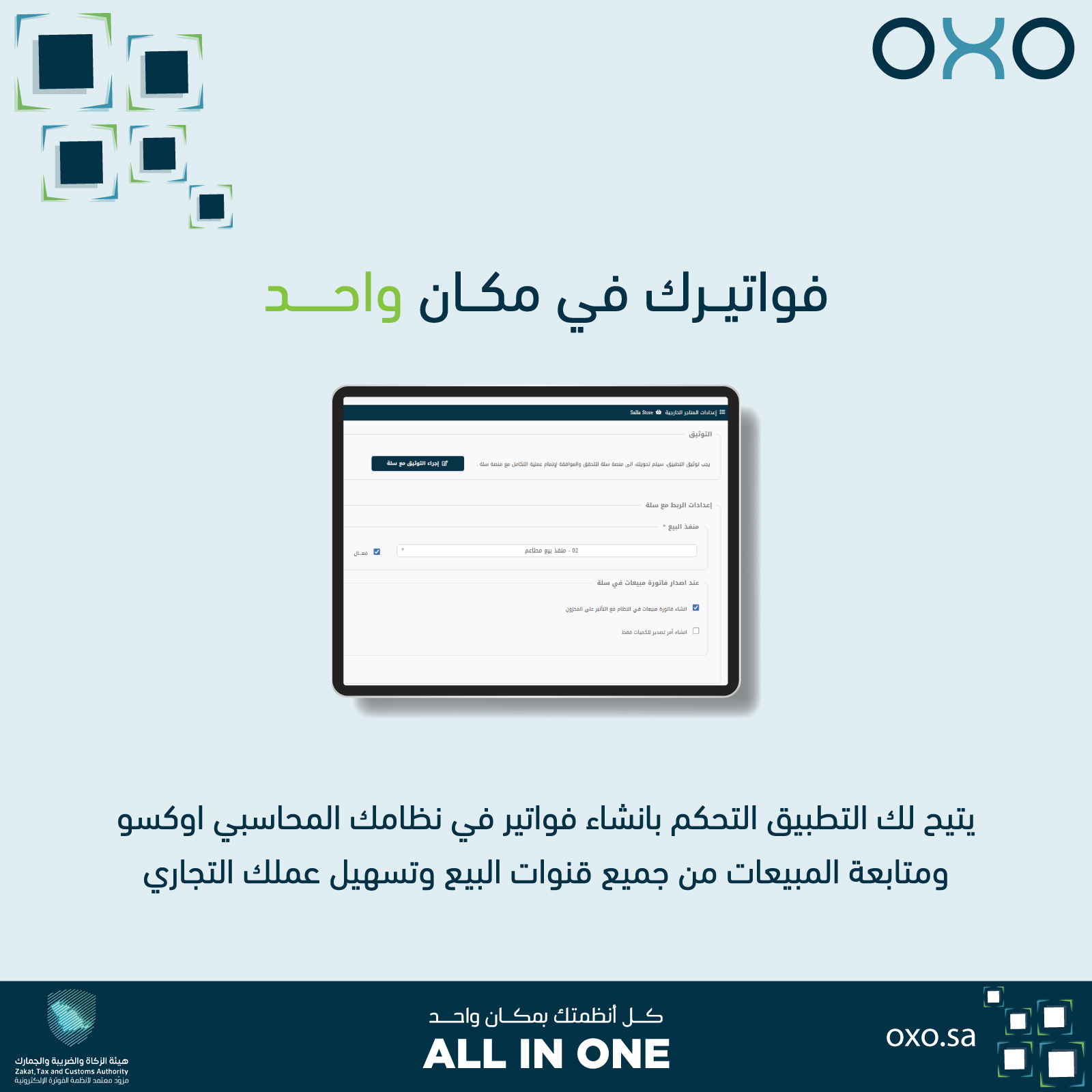 يعمل التطبيق كجسر بين منظومة إدارة الأعمال في أوكسو ومنصة سلة، ما يضمن أن جميع العمليات المتعلقة بالمخزون والجرد والفوترة تظل محدّثة بشكل آلي ومنسق سواء داخل المتجر الإلكتروني أو على مستوى الفروع والمتاجر الفيزيائية.
