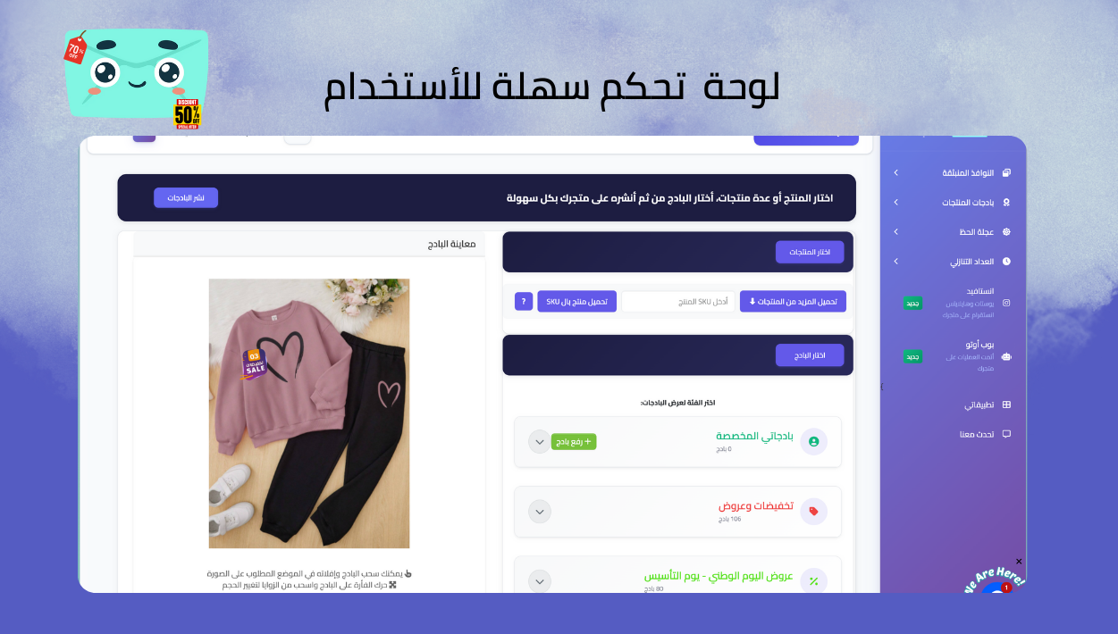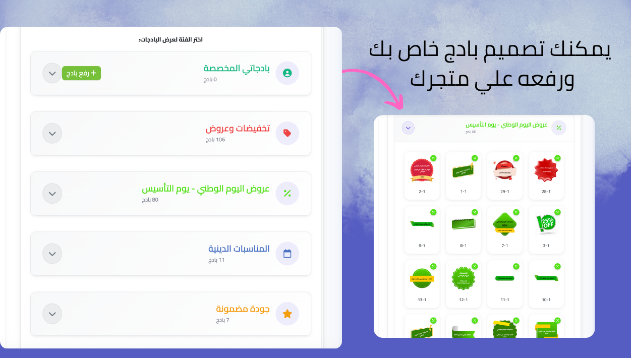- إمكانية تصميم بادجات موسمية خاصة تناسب مواسم التخفيضات أو المناسبات المختلفة