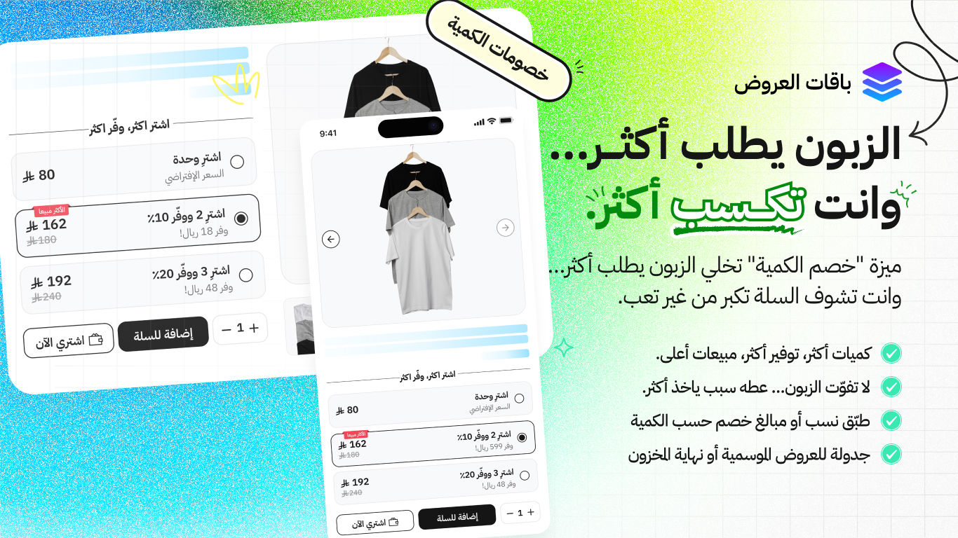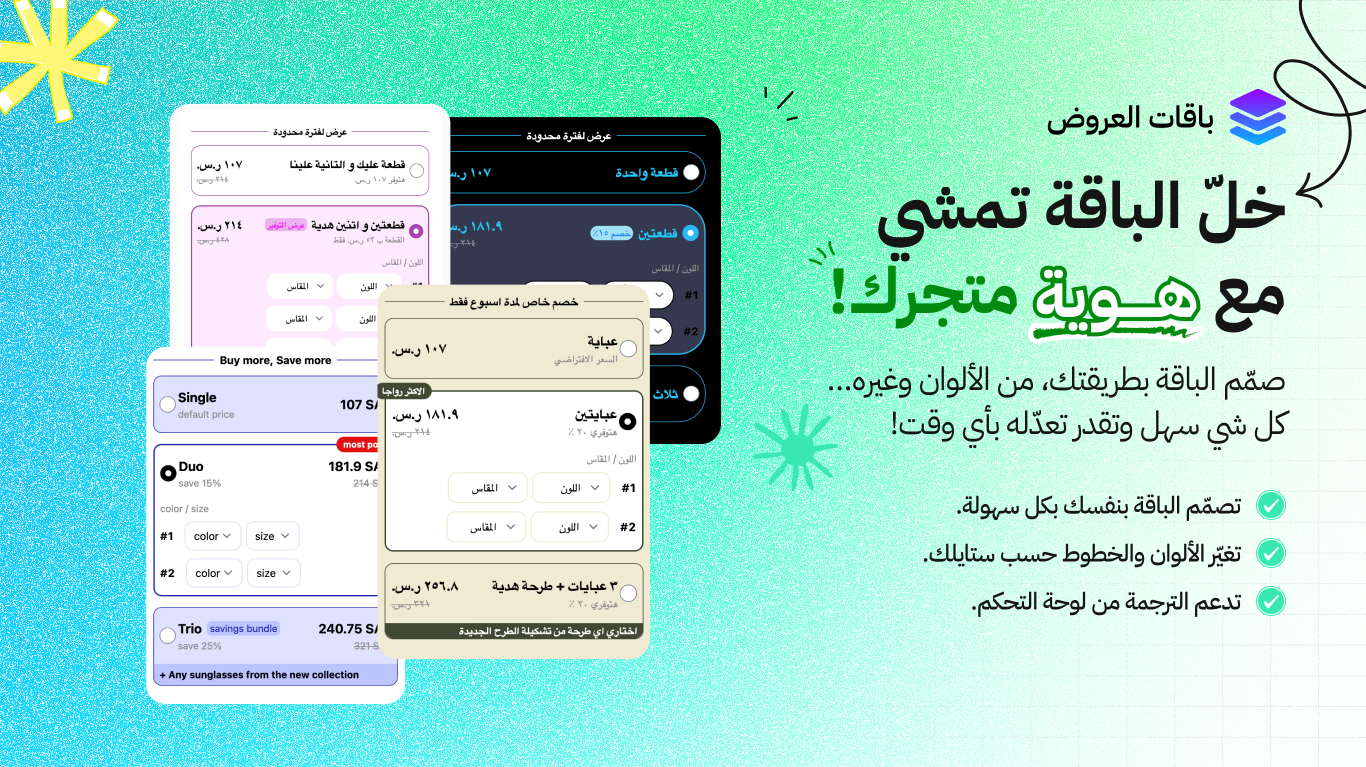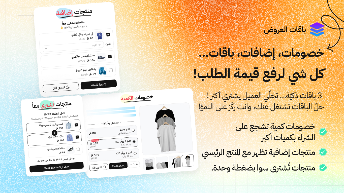 يستطيع التاجر أيضًا تحديد المنتجات أو الفئات التي تظهر عليها باقات العروض، مما يتيح ضبط تجربة البيع بدقة عالية ومرونة دون التقيّد بعرض شامل لكل المتجر.