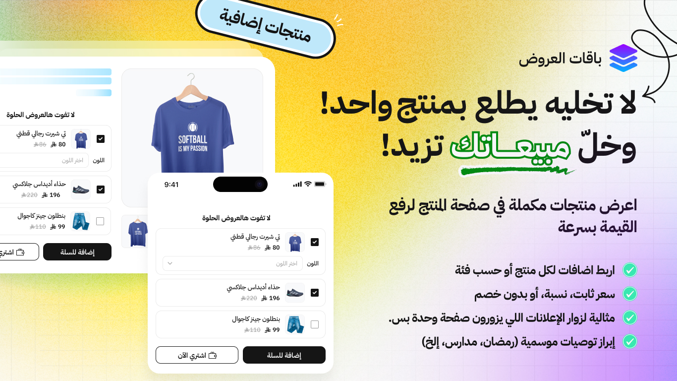 يتيح التطبيق أيضًا عرض منتجات تكميلية أو ملحقات على نفس صفحة المنتج مباشرة، بحيث تظهر هذه الإضافات أمام العميل فوق زر “أضف للسلة”، ما يزيد احتمالية إضافتها مع الطلب الأساسي دون الحاجة لأن يتنقل العميل لمتجات أخرى.