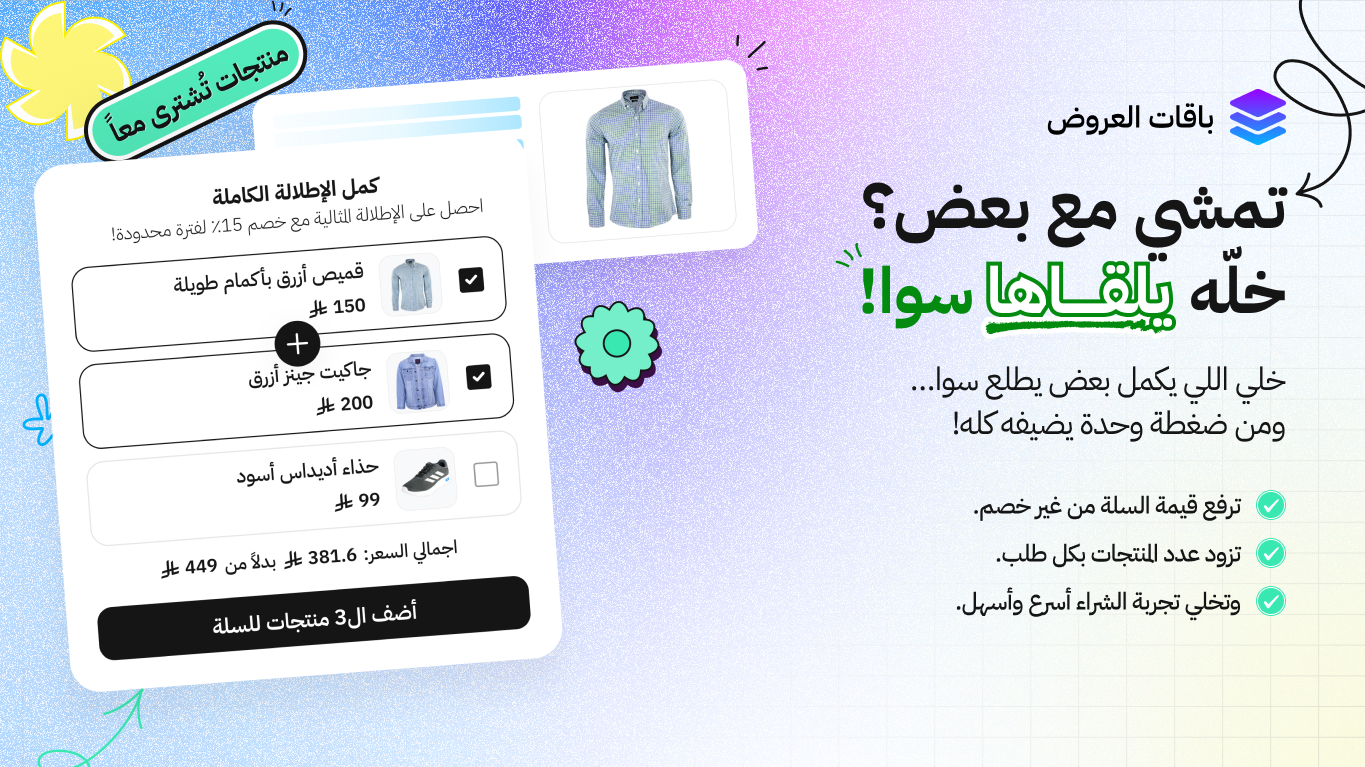 تطبيق “باقات العروض أب سيل و كروس سيل” يقدم حلولًا متقدمة لزيادة متوسط قيمة الطلب وتحفيز العملاء على شراء المزيد من المنتجات داخل متاجر منصة سلة. يتيح هذا التطبيق للتاجر ابتكار ثلاثة أنواع فعّالة من العروض التسويقية، تبدأ من الخصومات على الكميات، وتشمل الإضافات الفورية عند صفحة المنتج، وتنتهي بحزم منتجات متناسقة وجاهزة للشراء بضغطة واحدة، وكل ذلك من خلال لوحة تحكم موحّدة وبخطوات يسيرة.