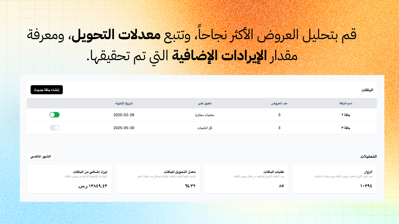 الحزم الجاهزة تؤدي إلى رفع معدلات البيع على المنتجات المتناسقة أو الموسمية، مما يعزز قيمة كل طلب بدون زيادة التكلفة التسويقية. لوحة التحليلات الفورية تمكّن صاحب المتجر من رصد الأداء واتخاذ قرارات تطويرية بناءً على بيانات واضحة.
