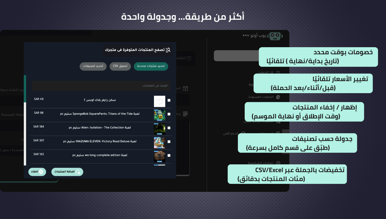 يوفر بوب أوتو إمكانية اختيار المنتجات المستهدفة للتعديلات حسب الحاجة، سواء فرديًا أو جماعيًا عبر قوائم Excel. بإمكانك كذلك تحديد التواريخ والأوقات بدقة لكل نوع من أنواع التغييرات: متى تريد بدء الخصم أو إنهائه، متى يظهر منتج جديد، أو متى ينتقل منتج لقسم معين. هذه المرونة تتيح لكل متجر بناء خطته الخاصة ومواعيد التنفيذ الملائمة له.