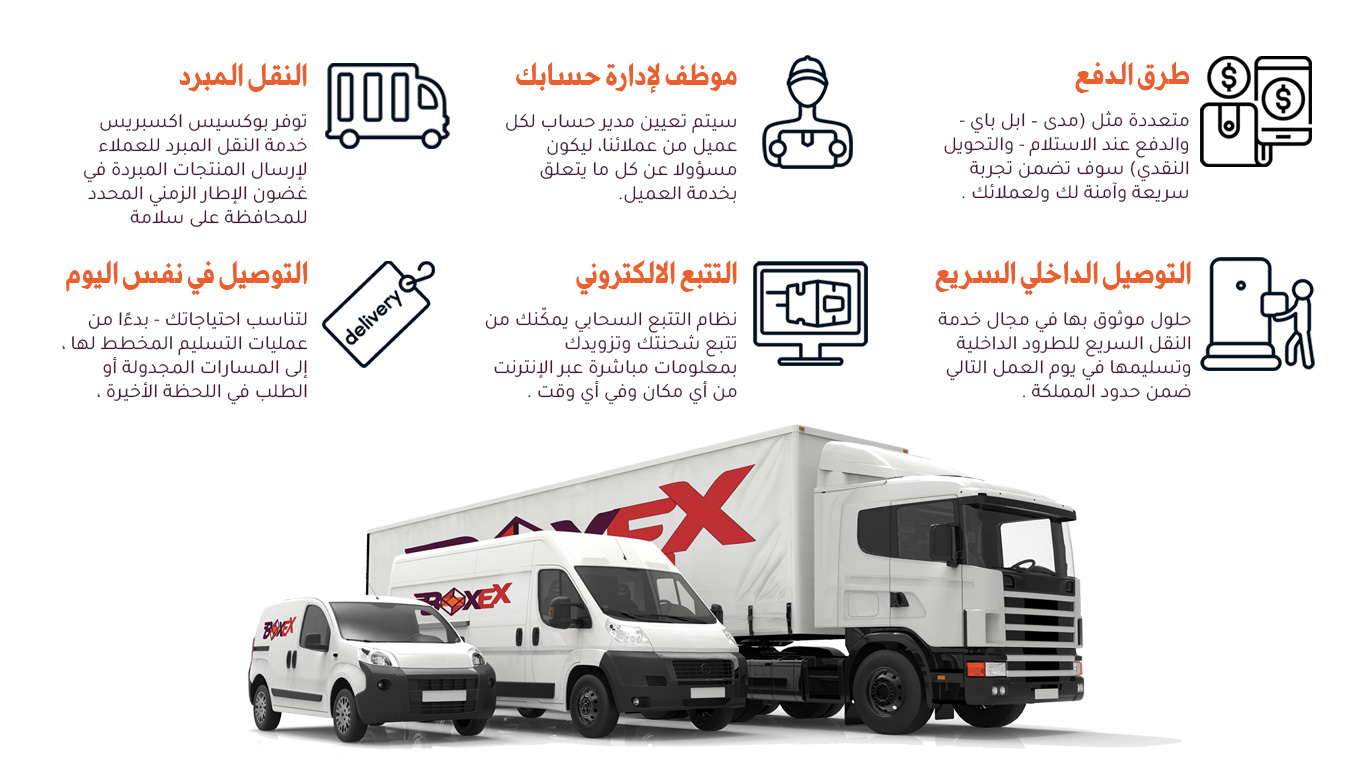 - خدمة النقل المبرد لدعم المنتجات التي تتطلب درجة حرارة محددة أثناء الشحن والتوصيل.