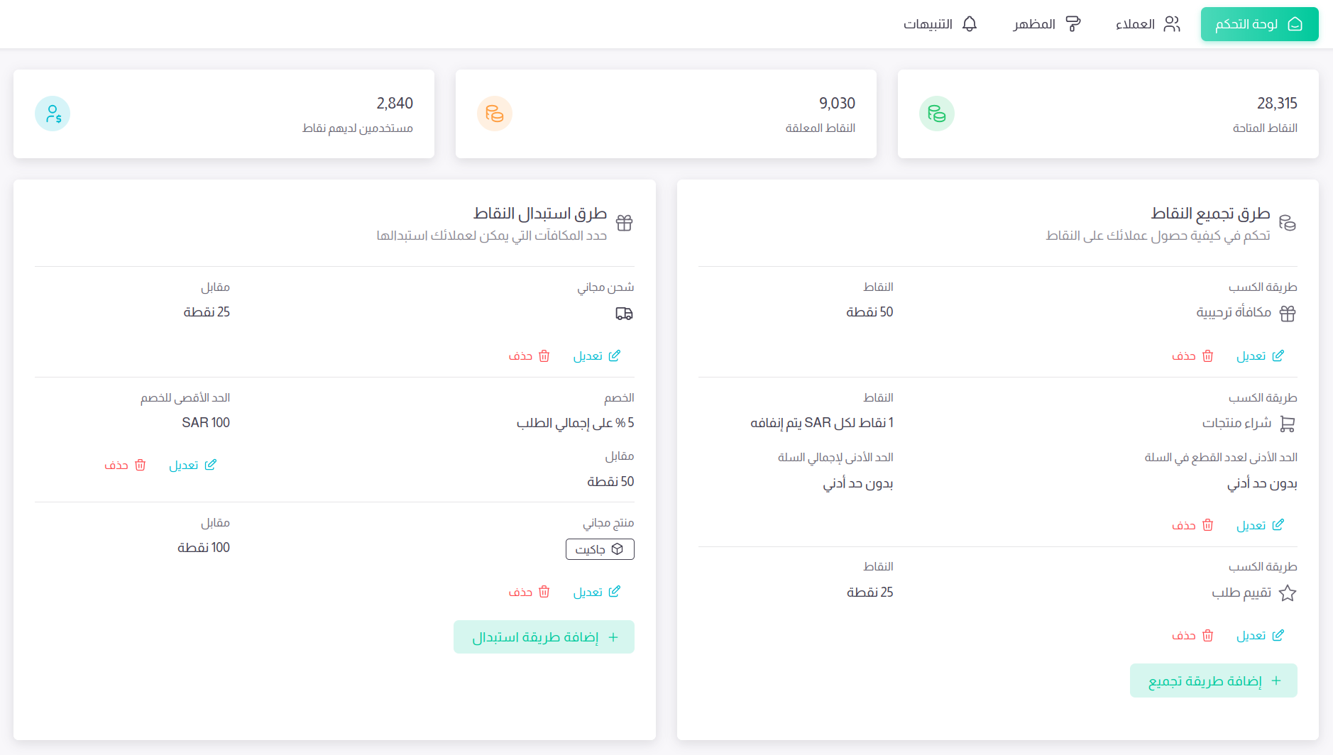 • إمكانية تخصيص كامل للمكافآت وعدد النقاط المطلوبة وفترة صلاحية كل عرض