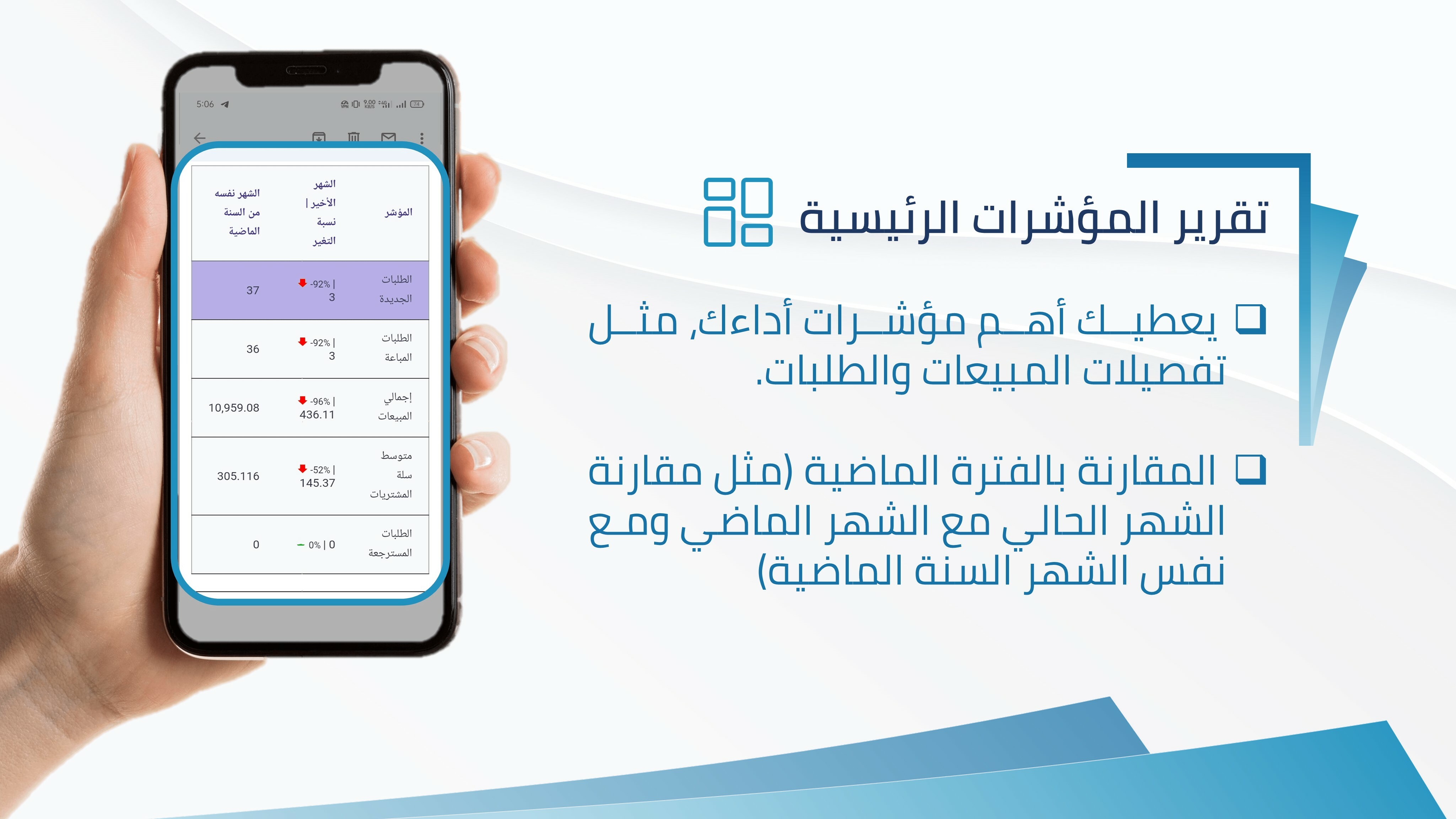 - عرض بيانات مثل المنتجات الأكثر مبيعاً، الطلبات الجديدة، الطلبات التي تم بيعها، مدى الاقتراب من هدف المبيعات، الطلبات المرتجعة ومتوسط سلة المشتريات