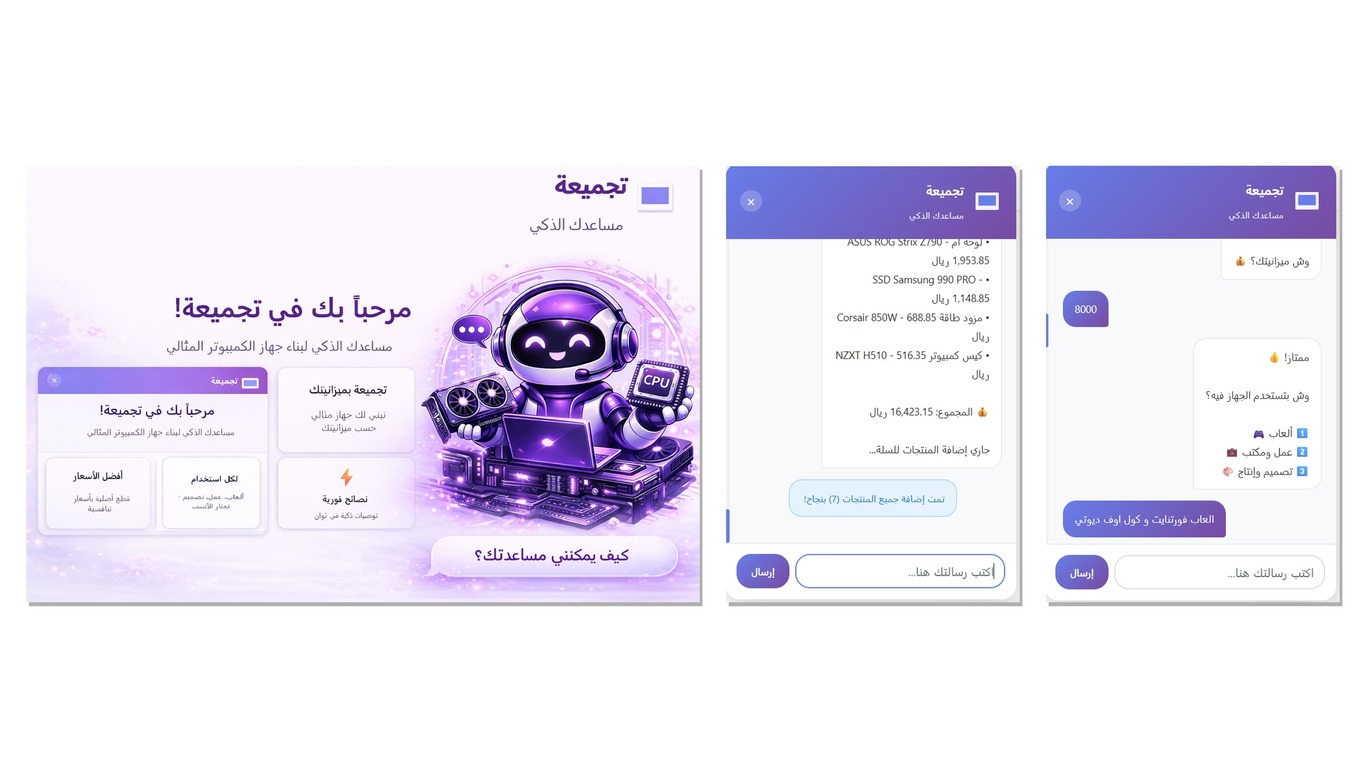 تجميعة هو تطبيق معد خصيصًا لمتاجر سلة التي تركز على بيع قطع الكمبيوتر والأجهزة المجمعة. يعمل هذا التطبيق كمساعد ذكي يساعد في بناء أجهزة الكمبيوتر المثالية اعتمادًا على ميزانية العميل واستخدامه، سواء كان الهدف ألعابًا، أو أعمالًا مكتبية، أو التصميم والإنتاج. يجمع التطبيق بين الذكاء الاصطناعي والتجربة المحلية ليمنح المستخدمين تجربة تسوق تفاعلية وسلسة خالية من التعقيد.