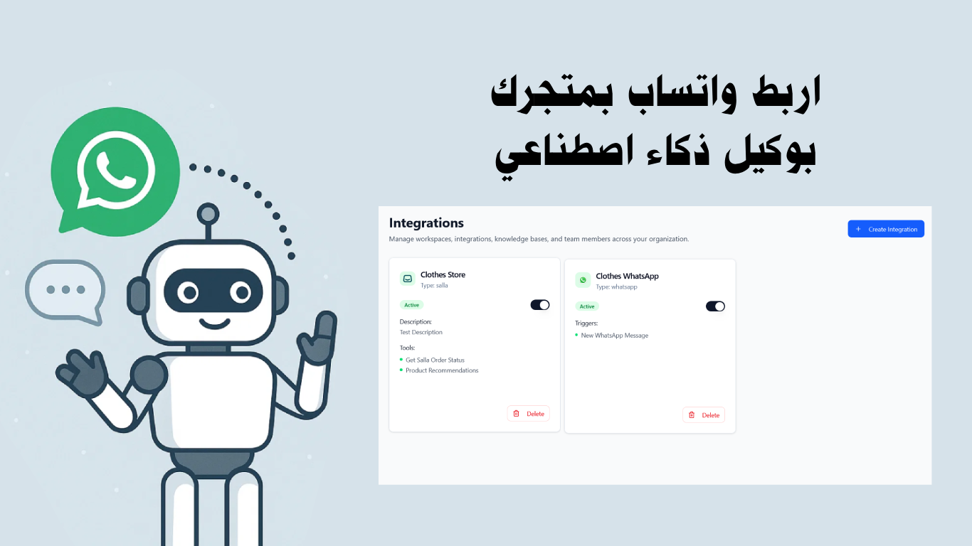 • ربط مباشر وسريع بين تطبيق واتساب للأعمال ومتجرك على سلة، مما يسمح بتحويل جميع استفسارات العملاء إلى محادثات واتساب يرد عليها الذكاء الاصطناعي فورًا.