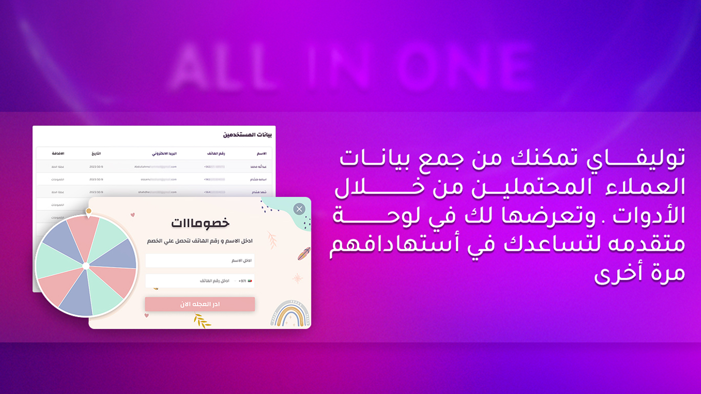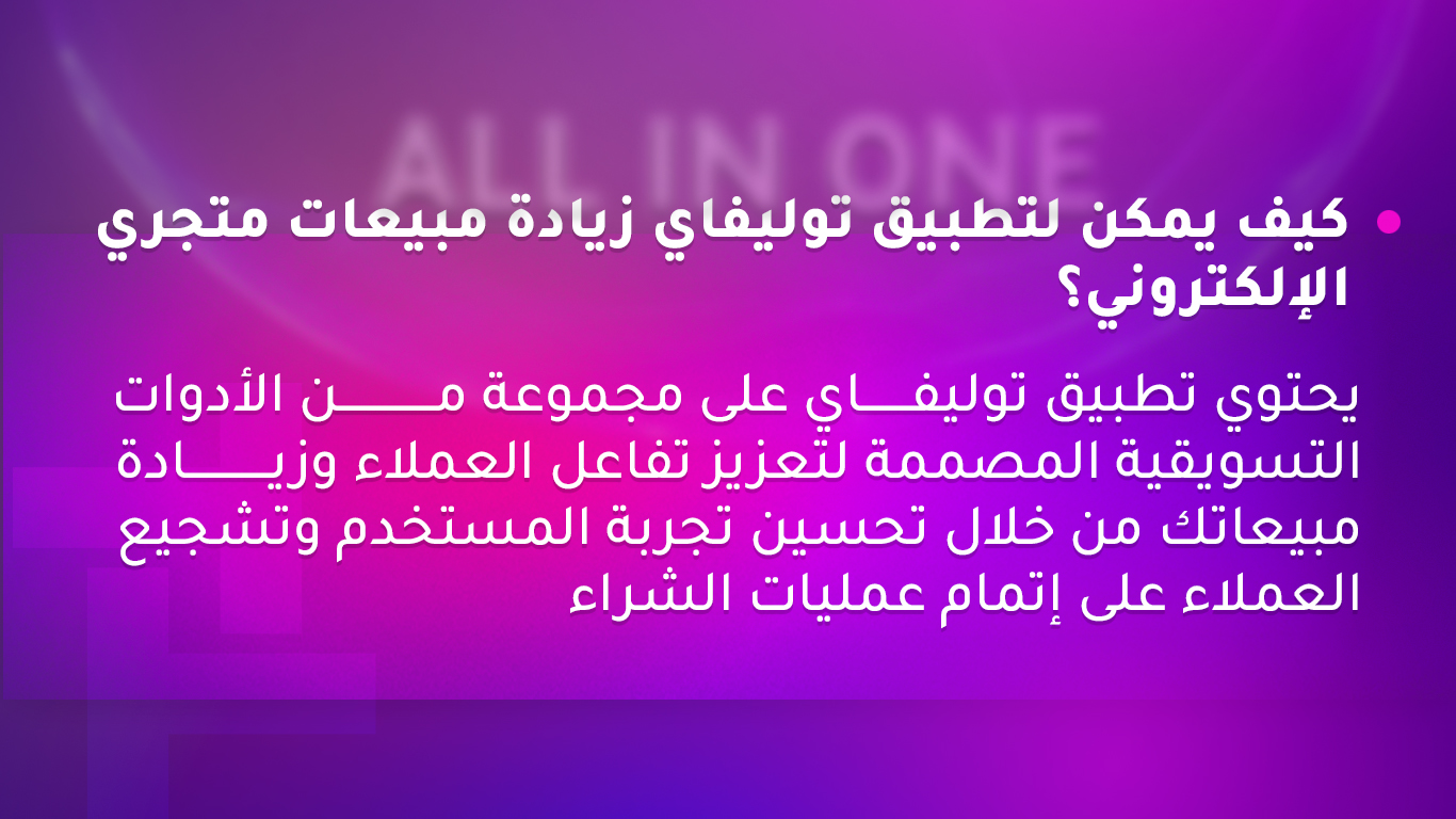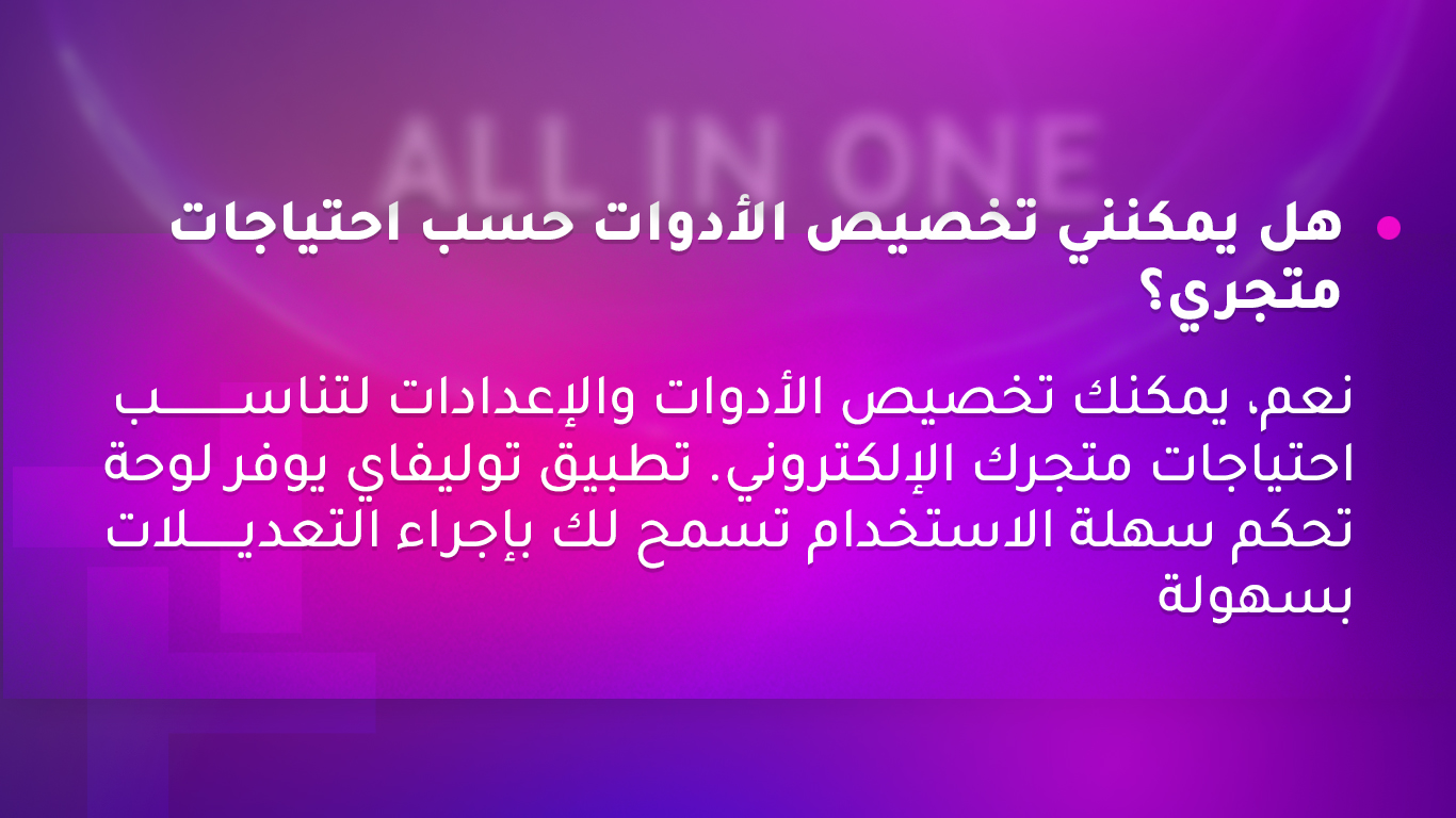التطبيق يعمل بشكل مركزي بحيث يمكن تفعيل أو إيقاف كل أداة تسويقية في أي وقت، وتعديل إعداداتها بسهولة تامة، بما يسمح بتجربة وتشغيل الحملات والخصومات دون تعقيدات أو الحاجة لاستشاريين تقنيين.