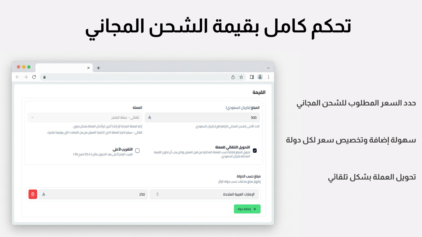 - تحديد حد أدنى للشحن المجاني مختلف لكل دولة، مما يتيح خيارات تسعير مرنة للمتاجر متعددة الدول.