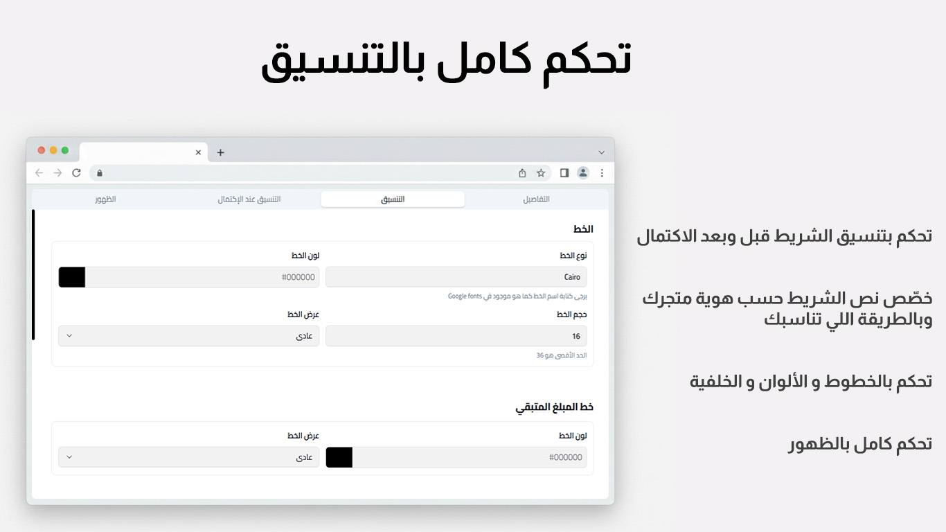 - تخصيص كامل للنصوص، الألوان، والخطوط بحيث يمكن التحكم بشكل الشريط ليتماشى مع هوية المتجر.