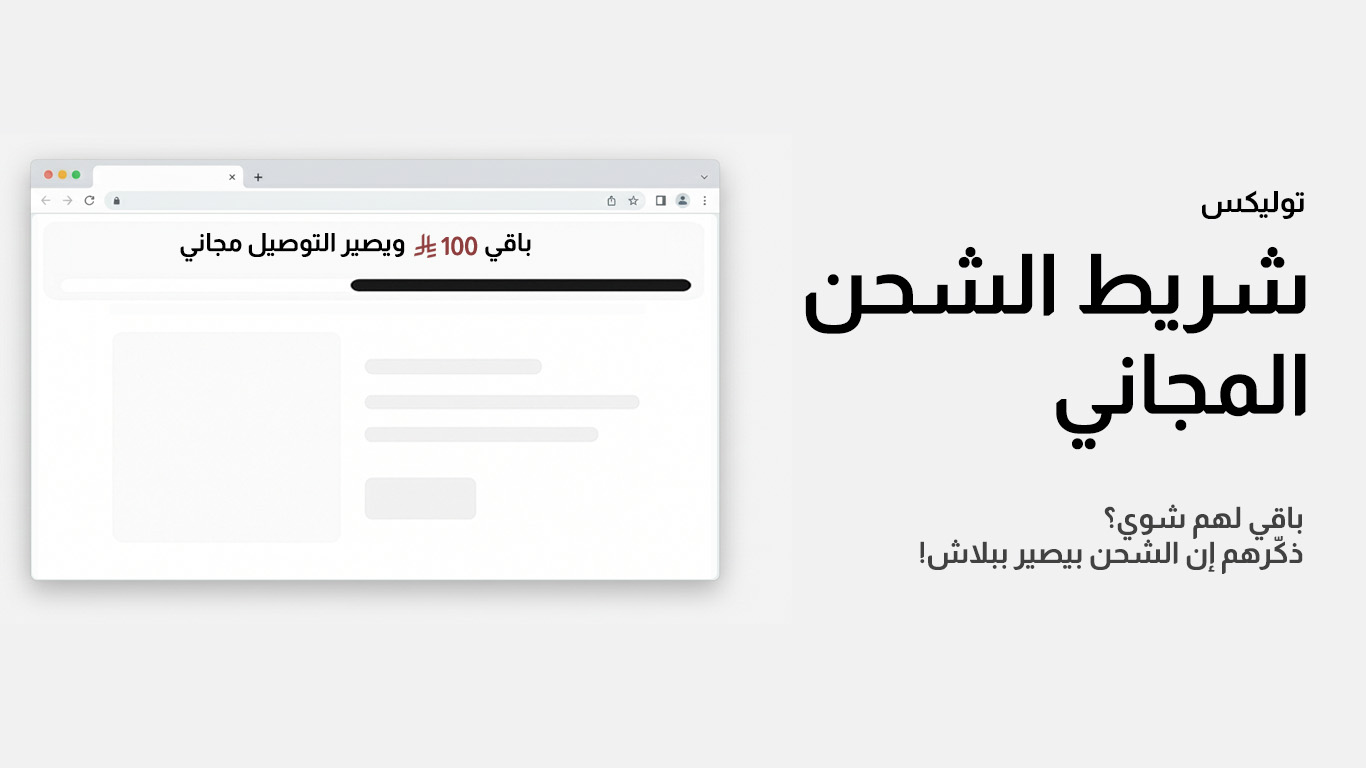 توليكس – شريط الشحن المجاني هو تطبيق مُخصص لمتاجر منصة سلة، يهدف إلى زيادة تحفيز العملاء على إتمام الطلبات عن طريق عرض شريط تفاعلي يُوضح لهم مقدار ما تبقى للوصول إلى حد الشحن المجاني. يقدم هذا الشريط حلاً عمليًا لجذب الزوار نحو رفع متوسط قيمة السلة، مع تصميم يمكن تخصيصه ليتناسب مع هوية المتجر على جميع الأجهزة.