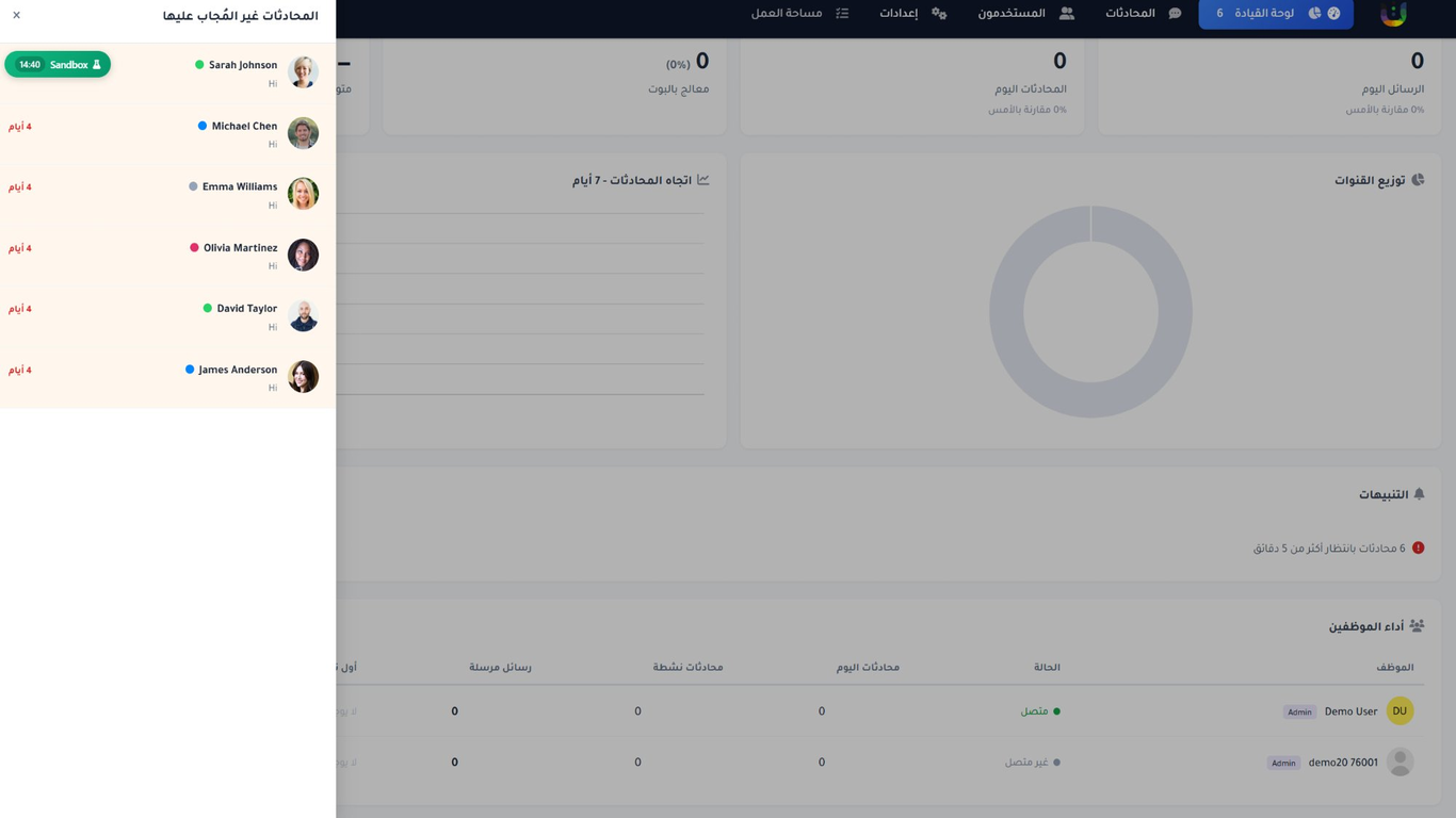 - توزيع المحادثات بين أعضاء الفريق وإضافة الملاحظات ومتابعة الأداء بشكل تعاوني