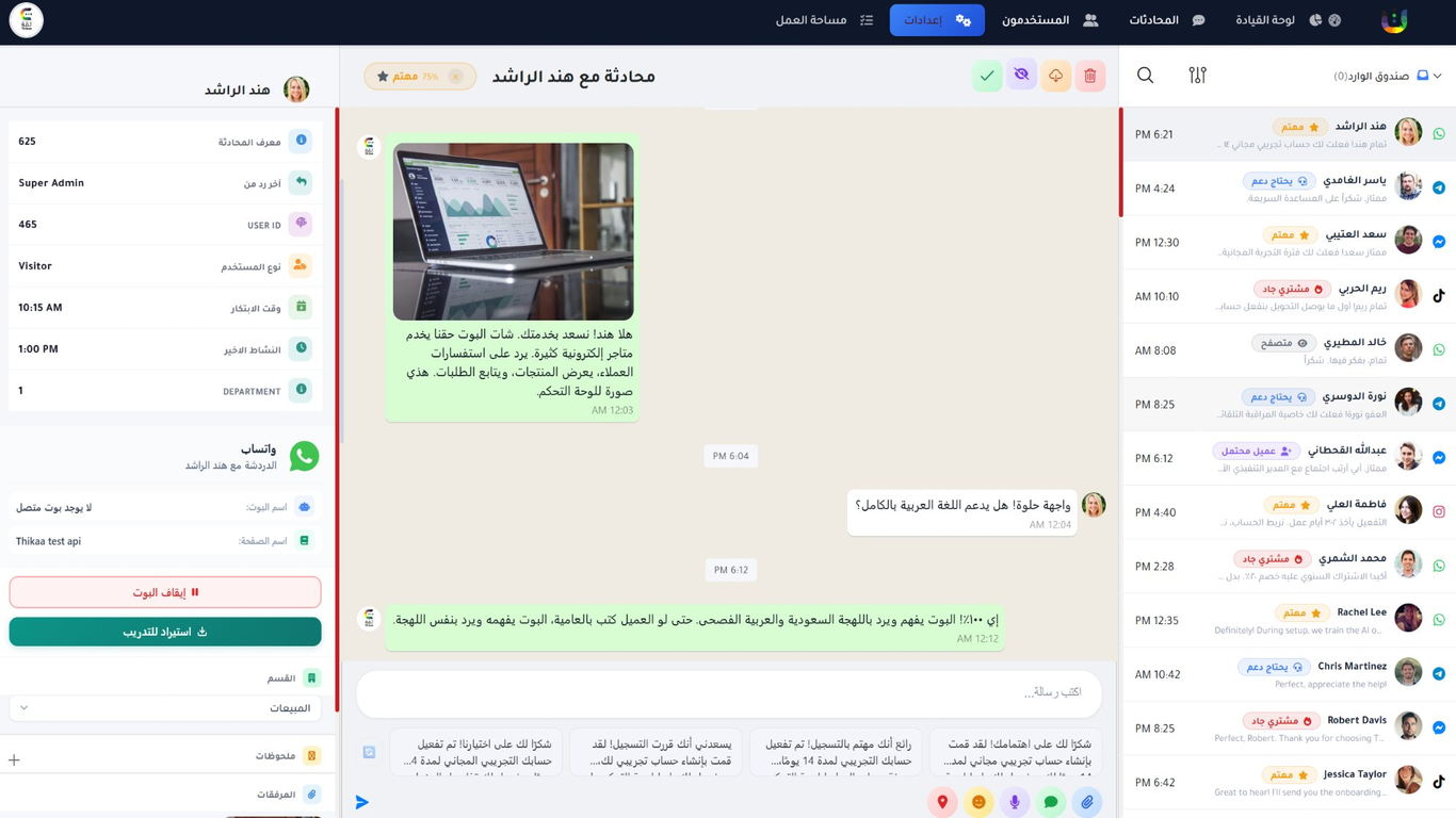 - صندوق وارد موحّد يجمع محادثات واتساب وانستغرام وتيك توك ومحادثات الموقع بلوحة تحكم واحدة