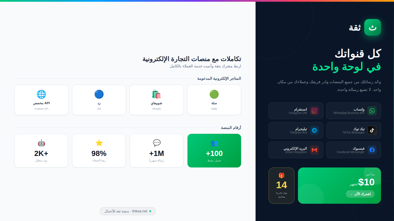 ثقة بوت هو تطبيق متخصص في تحسين التواصل مع العملاء بشكل احترافي وسهل عبر منصات المحادثة المختلفة. يتيح للتجار وأصحاب المتاجر الإلكترونية على منصة سلة إدارة كل المحادثات والاستفسارات الواردة من قنوات تواصل متعددة مثل واتساب، انستغرام، وتيك توك من خلال لوحة تحكم موحدة. يعتمد التطبيق على تقنيات الذكاء الاصطناعي لفهم الأسئلة والاستفسارات الواردة، وتقديم إجابات تلقائية دقيقة تتناسب مع بيئة وأسواق الشرق الأوسط، مع دعم للغة العربية واللهجات المحلية.