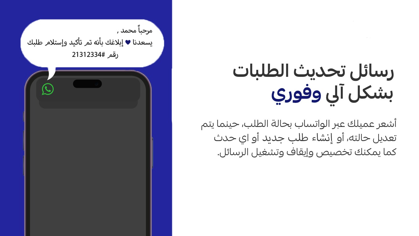 • إرسال آلي لتحديثات حالة الطلبات عبر الواتساب فور حدوث التغييرات