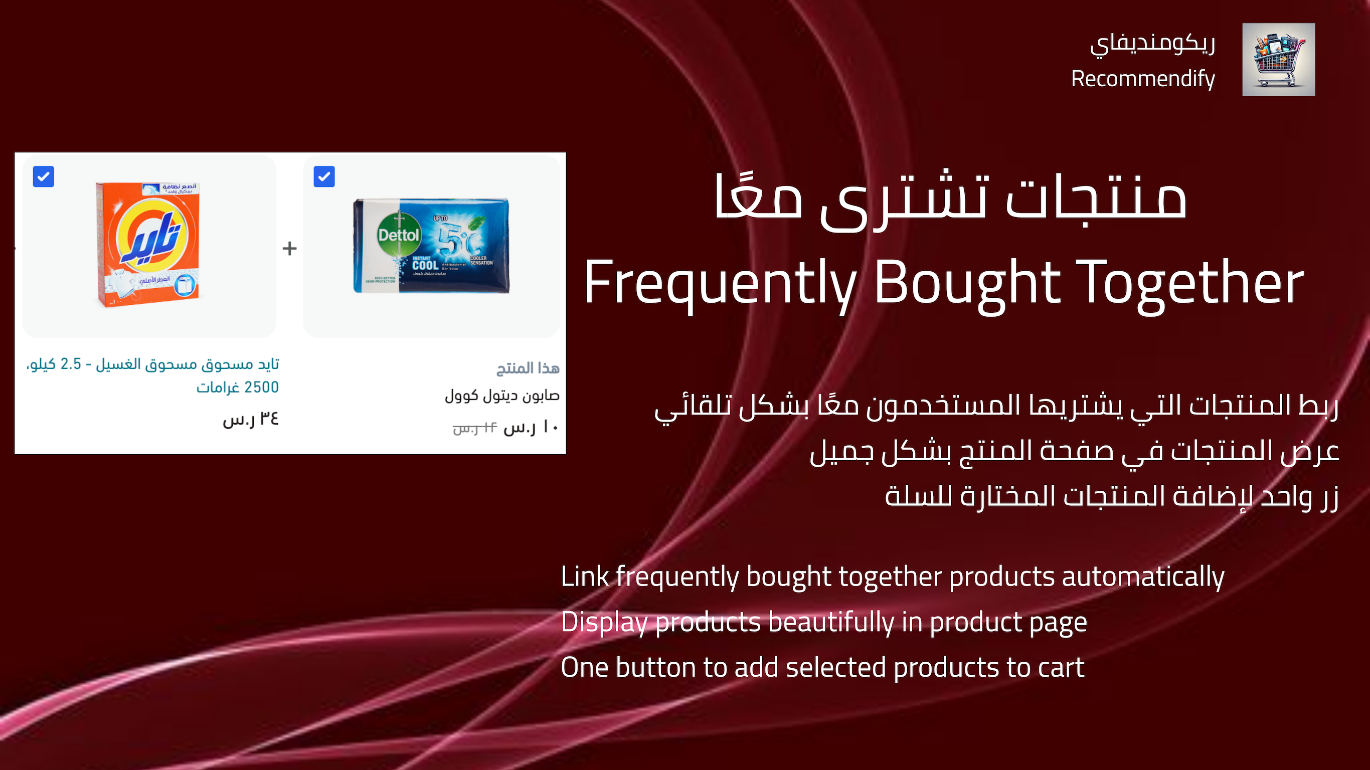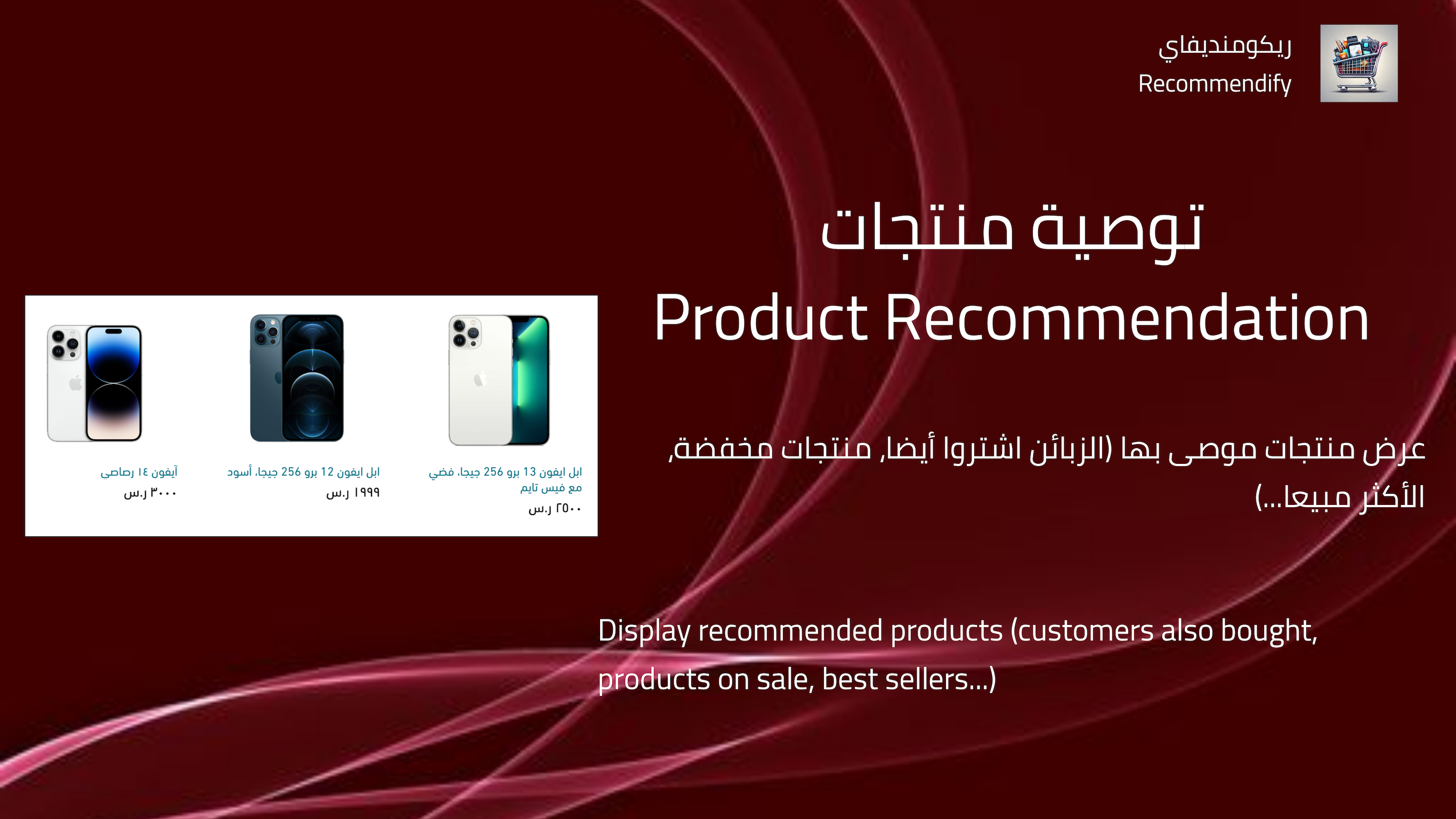 يساعد ريكومنديفاي على زيادة معدل المبيعات في متجرك من خلال تحسين تجربة الزائر واقتراح منتجات إضافية قد تهمه أثناء زيارته صفحات المنتجات أو مراحل إنهاء الشراء. تظهر المنتجات المقترحة بناءً على سلوك العميل، سواء كان عرض المنتجات الأكثر شعبية أو المنتجات المرتبطة بما شاهده أو اشتراه سابقًا، مما يعزز فرصة إتمام عمليات شراء متكررة.