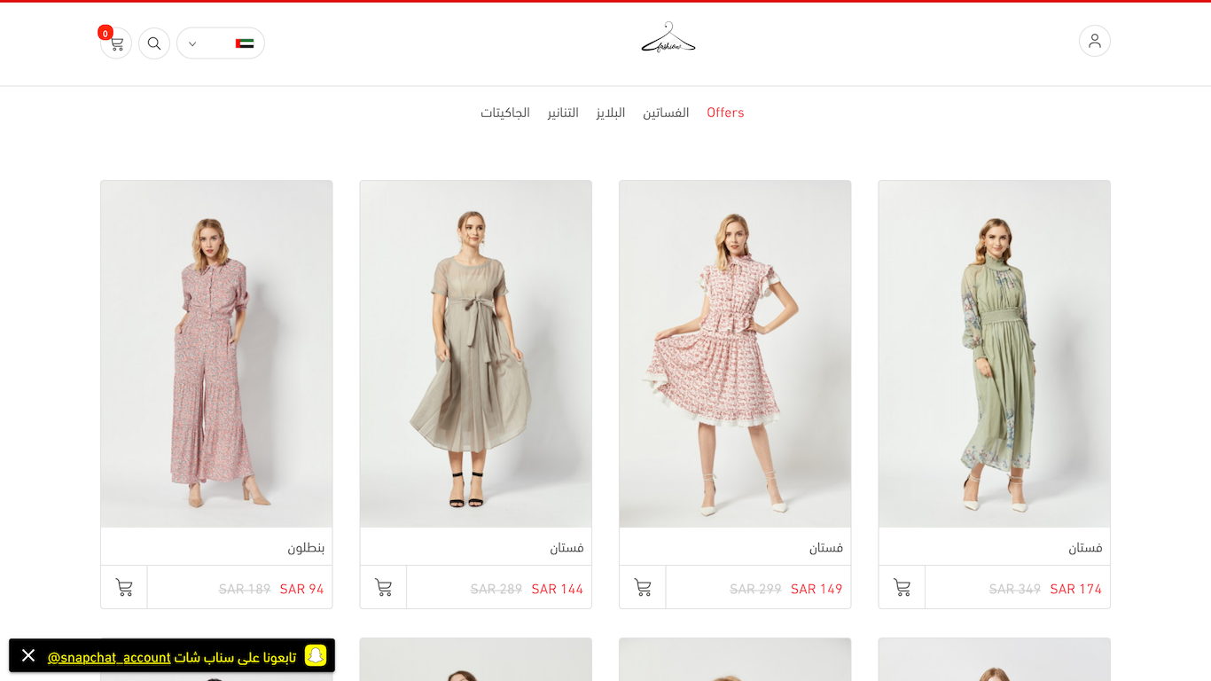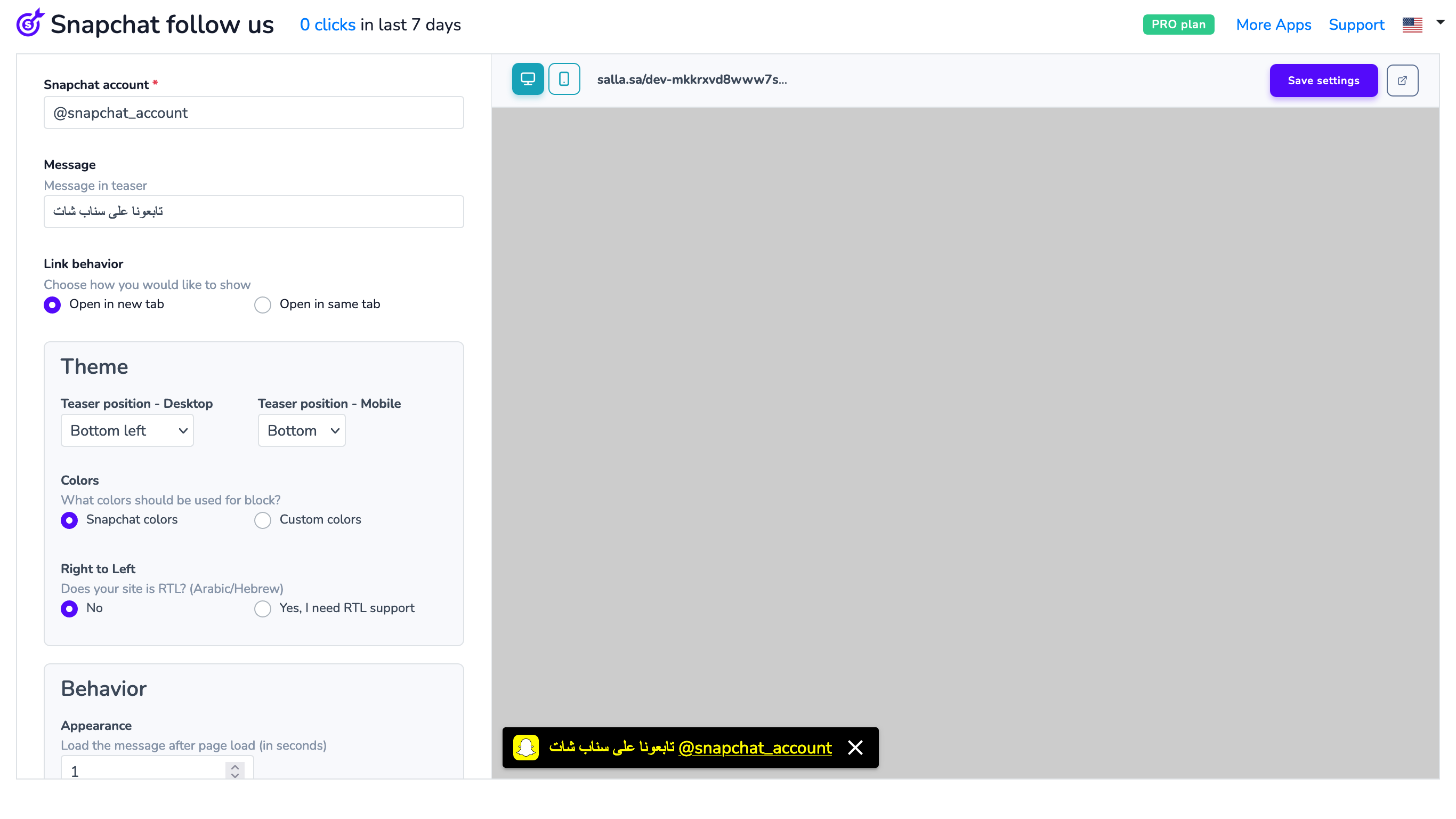 يعتمد تطبيق سناب شات – Follow Us على عرض رسالة تظهر بشكل واضح ولطيف للعملاء أثناء تصفحهم متجر سلة، حيث تدعوهم هذه الرسالة إلى متابعة الحساب الخاص بك على سناب شات. الرسالة ليست مزعجة أو تطفلية، بل تظهر بمكان استراتيجي يجعلها مرئية دون أن تؤثر على تجربة العميل في التصفح أو الشراء.