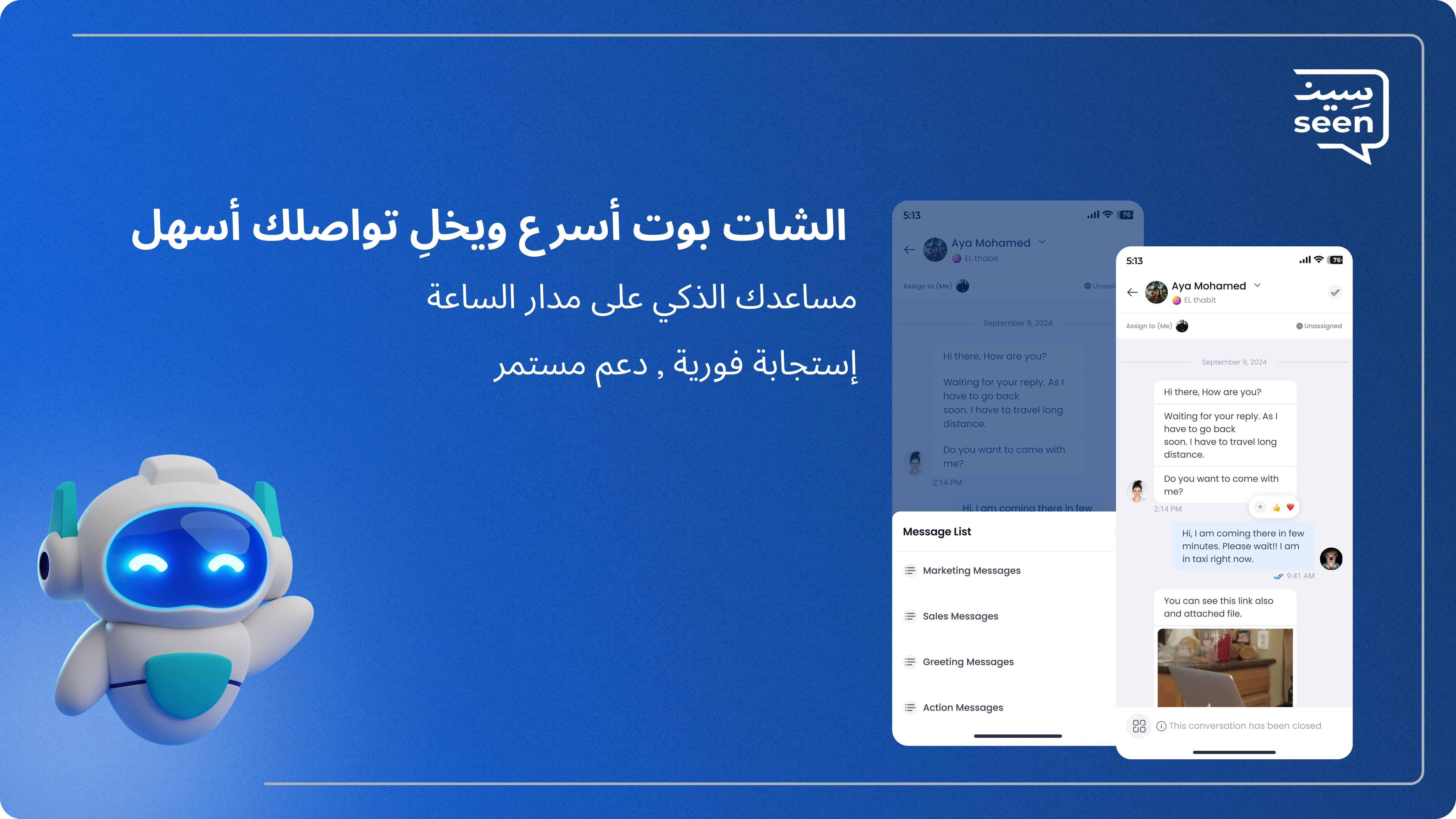 تتيح منصة سين لفريق خدمة العملاء استخدام النظام من الهواتف المحمولة أو أجهزة الكمبيوتر دون الحاجة لتعدد الأرقام، حيث يدير الجميع المحادثات الواردة والصادرة عبر رقم واتساب واحد فقط. وبفضل تكامل الشات بوت، تصبح الردود الفورية والآلية متاحة على مدار الساعة، مما يحسن من سرعة الخدمة وانسيابية المحادثة مع العملاء المتكررين والجدد على حد سواء.