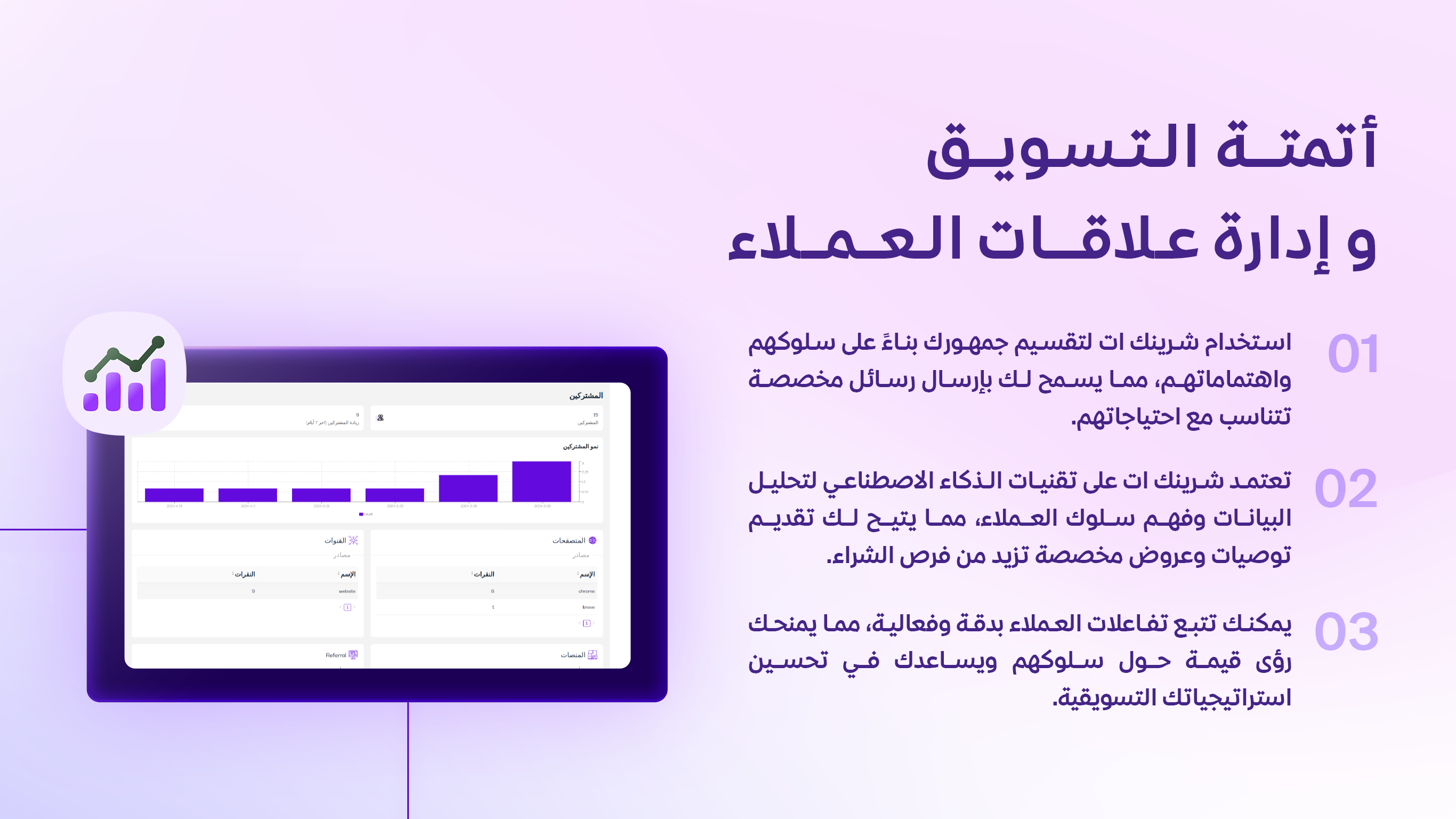 • تقسيم العملاء الذكي لربط كل حملة تسويقية بالفئة المعنية بناءً على اهتماماتهم وتاريخهم في الشراء