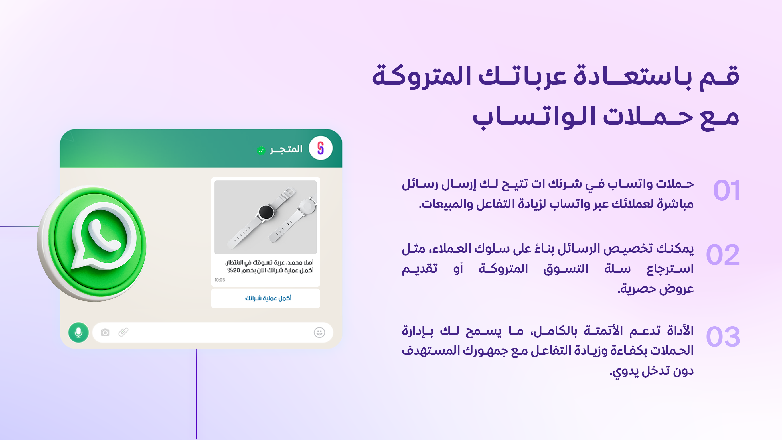 • التواصل من خلال واتساب عبر رسائل جماعية وإمكانية استعادة سلة المشتريات المهجورة