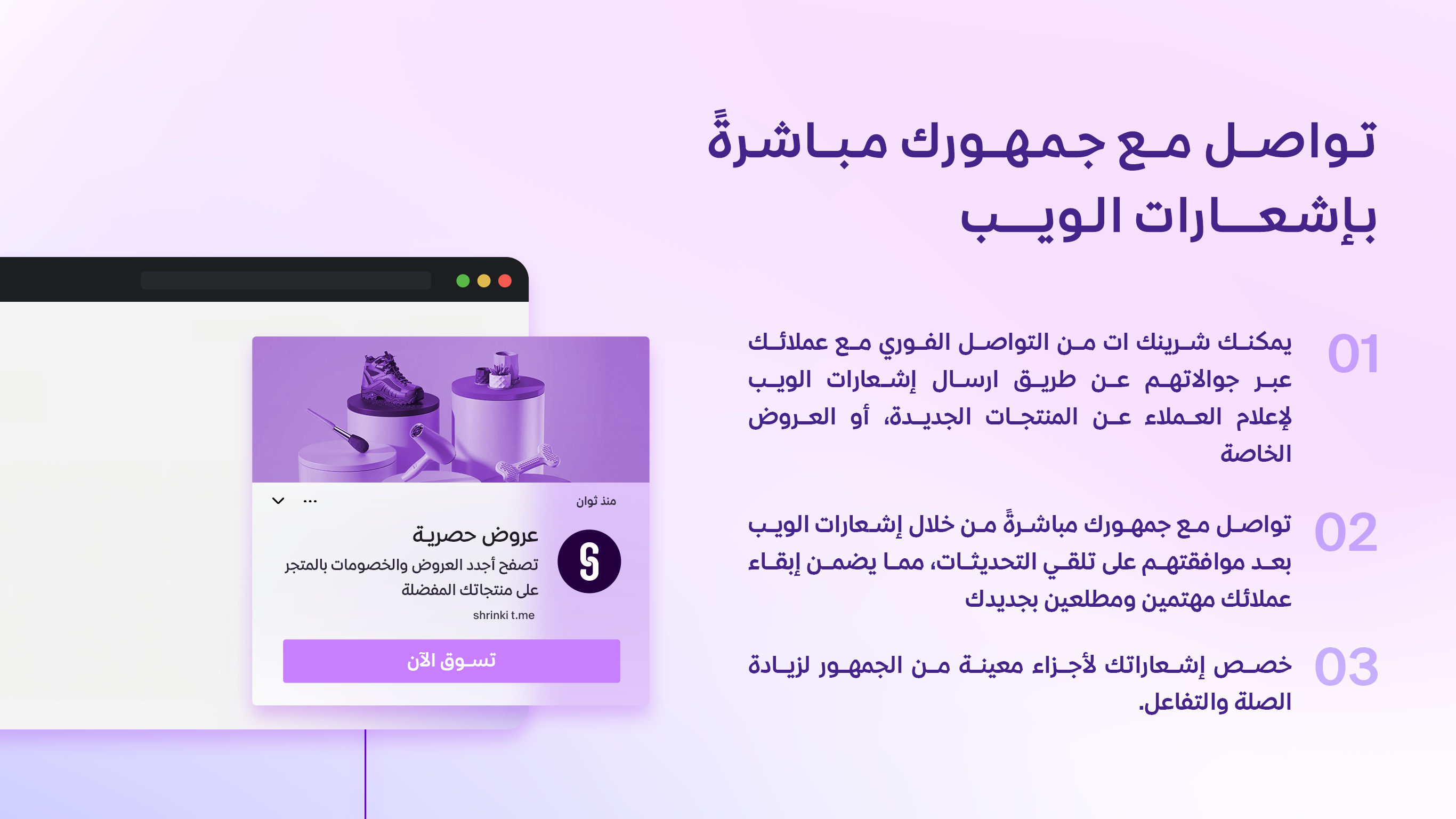 • إرسال الإشعارات الفورية عبر المتصفح لإعلام العملاء بالعروض والخصومات فورًا