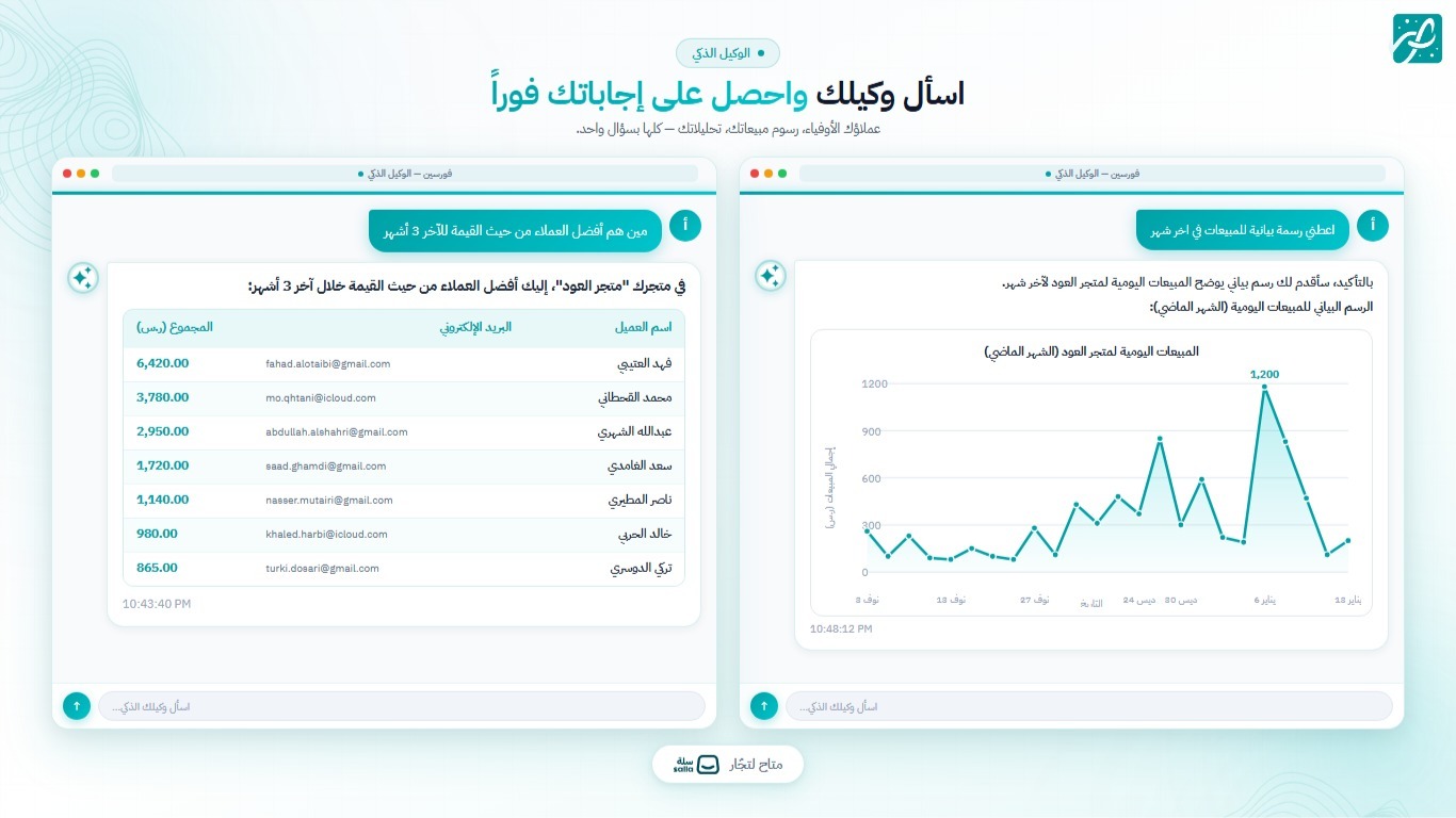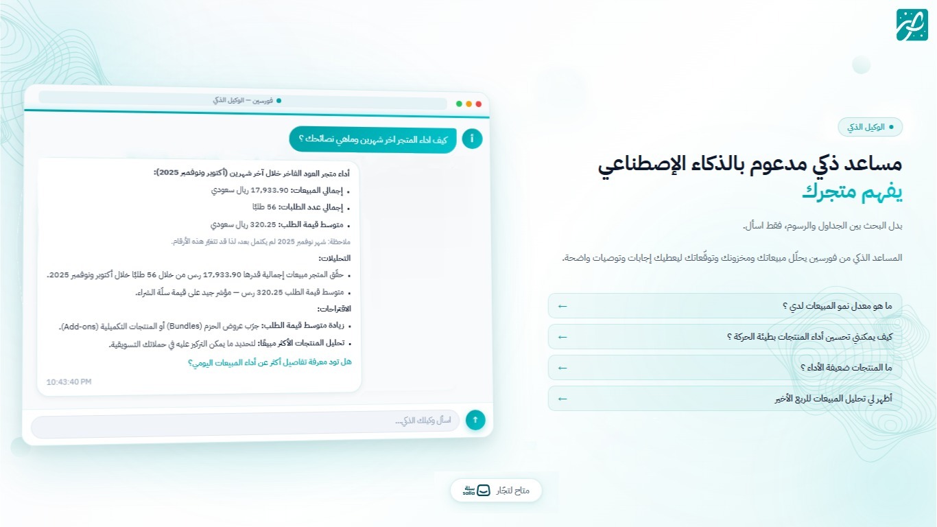 بالإضافة إلى التحليل التلقائي للبيانات، يقدم التطبيق مساعدًا ذكيًا يمكن للتاجر التفاعل معه مباشرة، كأن يسأله عن أداء منتج محدد، أو يحصل منه على توصيات بشأن إعادة الطلب والكميات المثلى. هكذا يوفر فورسين وسيلة مرنة لإيجاد أجوبة عملية لأي سؤال متعلق بعمليات المتجر والمخزون والمبيعات، كل ذلك داخل منصة سلة نفسها.