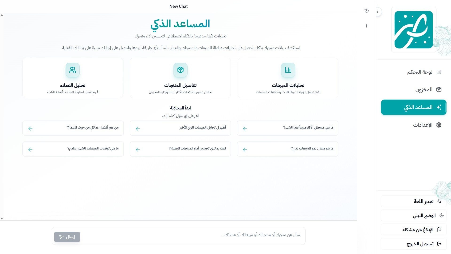 • مساعد ذكي يعمل كمحلل بيانات شخصي يمكن سؤاله عن تفاصيل المبيعات أو أداء المنتجات أو مخزون المتجر