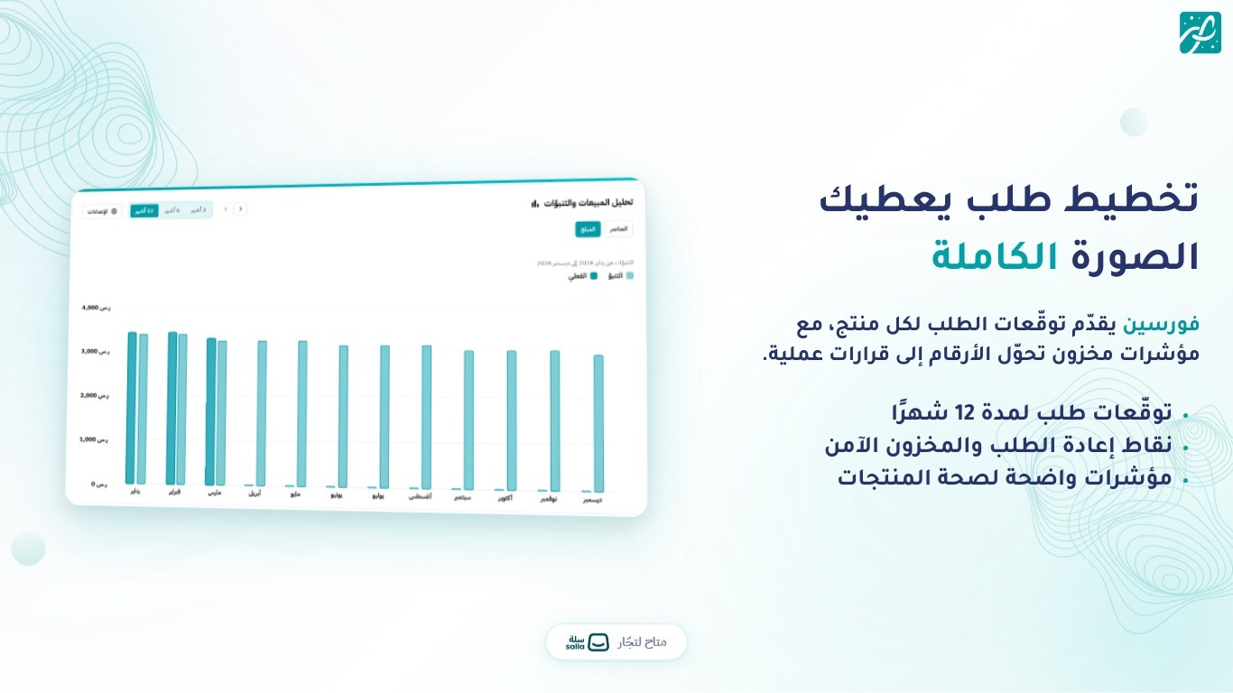 تمثل فورسين أداة ذكية متكاملة تدعم أصحاب المتاجر الإلكترونية العاملة على منصة سلة في تخطيط الطلب وتحليل الأداء بشكل عملي وفعال. لا تقتصر وظيفة التطبيق على تقديم التقارير التقليدية، بل يتجاوز ذلك ليعمل كمحلل بيانات افتراضي يساعد التاجر على فهم سلوك المبيعات، متابعة صحة المنتجات، وضبط مستويات المخزون بسهولة ووضوح. بالاعتماد على الذكاء الاصطناعي، يتيح التطبيق اتخاذ قرارات محسوبة تهدف إلى زيادة الأرباح وتجنب التعقيدات المرتبطة بالتقارير الرقمية المعتادة.