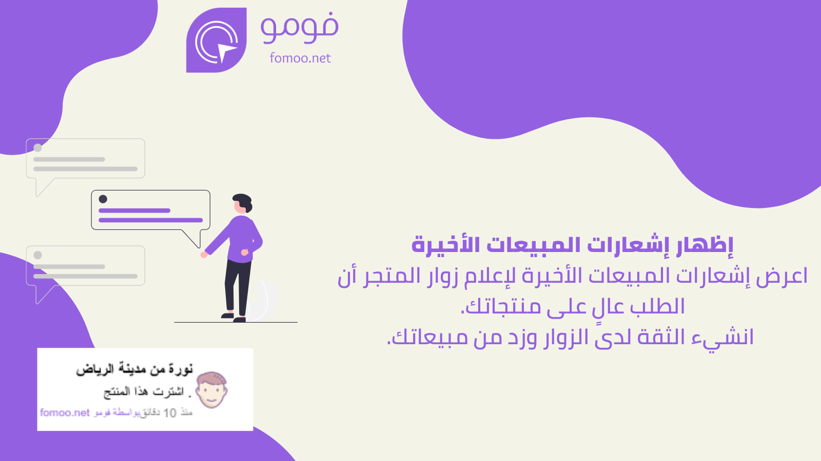 يُدمج فومو بسهولة ضمن متجر سلة الخاص بك ليعرض إشعارات تلقائية للزوار بناءً على الأحداث الفعلية داخل المتجر مثل عمليات الشراء الجديدة، التقييمات التي يضعها العملاء، أو حتى تفعيل كوبونات الخصم. تقدم هذه الإشعارات للمستخدم معلومات شاملة عن تفاعل الزبائن الآخرين وتعزز الثقة بمصداقية المتجر.