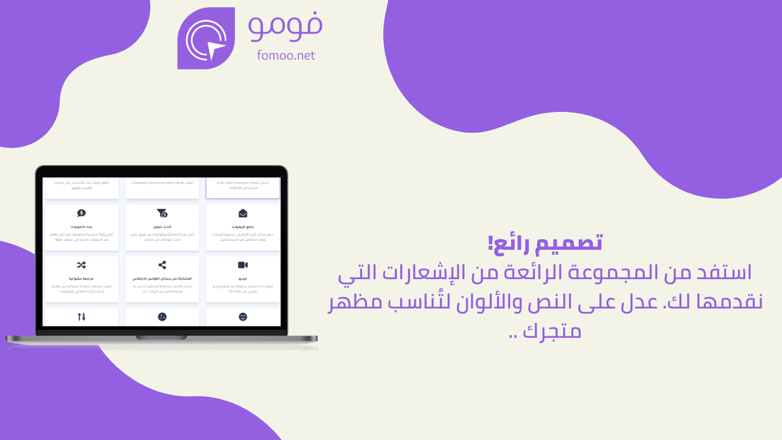 يمكّن فومو تاجر سلة من التحكم الكامل في تصميم ونصوص الإشعارات، بدءًا من اختيار نوع الإشعار، تعديل الكلمات المستخدمة، وصولًا إلى تخصيص الألوان والخطوط بما ينسجم مع الهوية البصرية للمتجر.