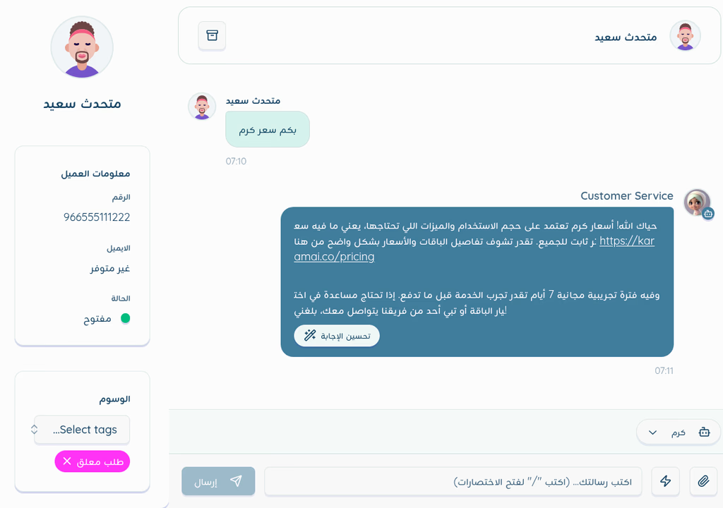 - تحويل المحادثة تلقائيًا إلى موظف عند الحاجة مع إرسال تنبيه فوري إلى تطبيق كرم لسرعة الاستجابة