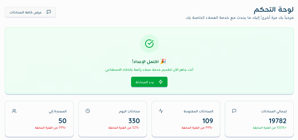 - لوحة تحكم متكاملة لإدارة المحادثات وتنظيم فرق الدعم وإعدادات الذكاء الاصطناعي