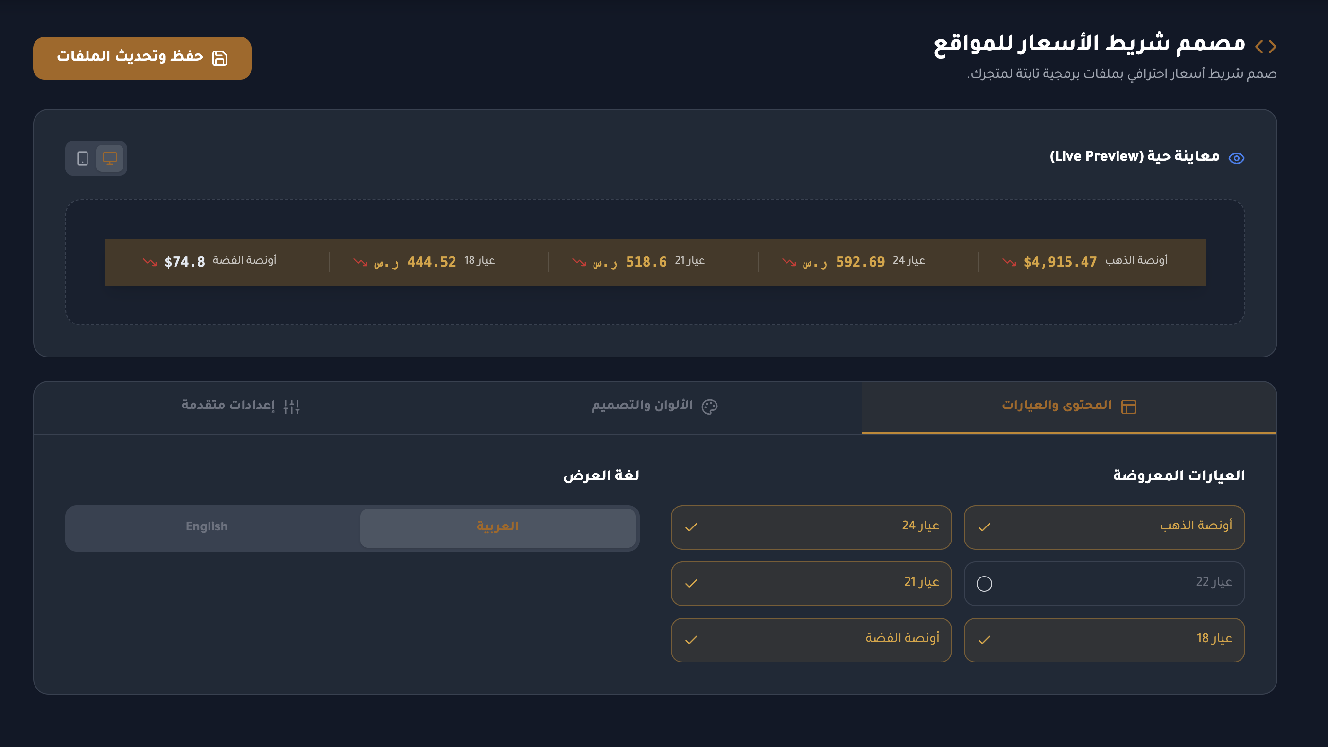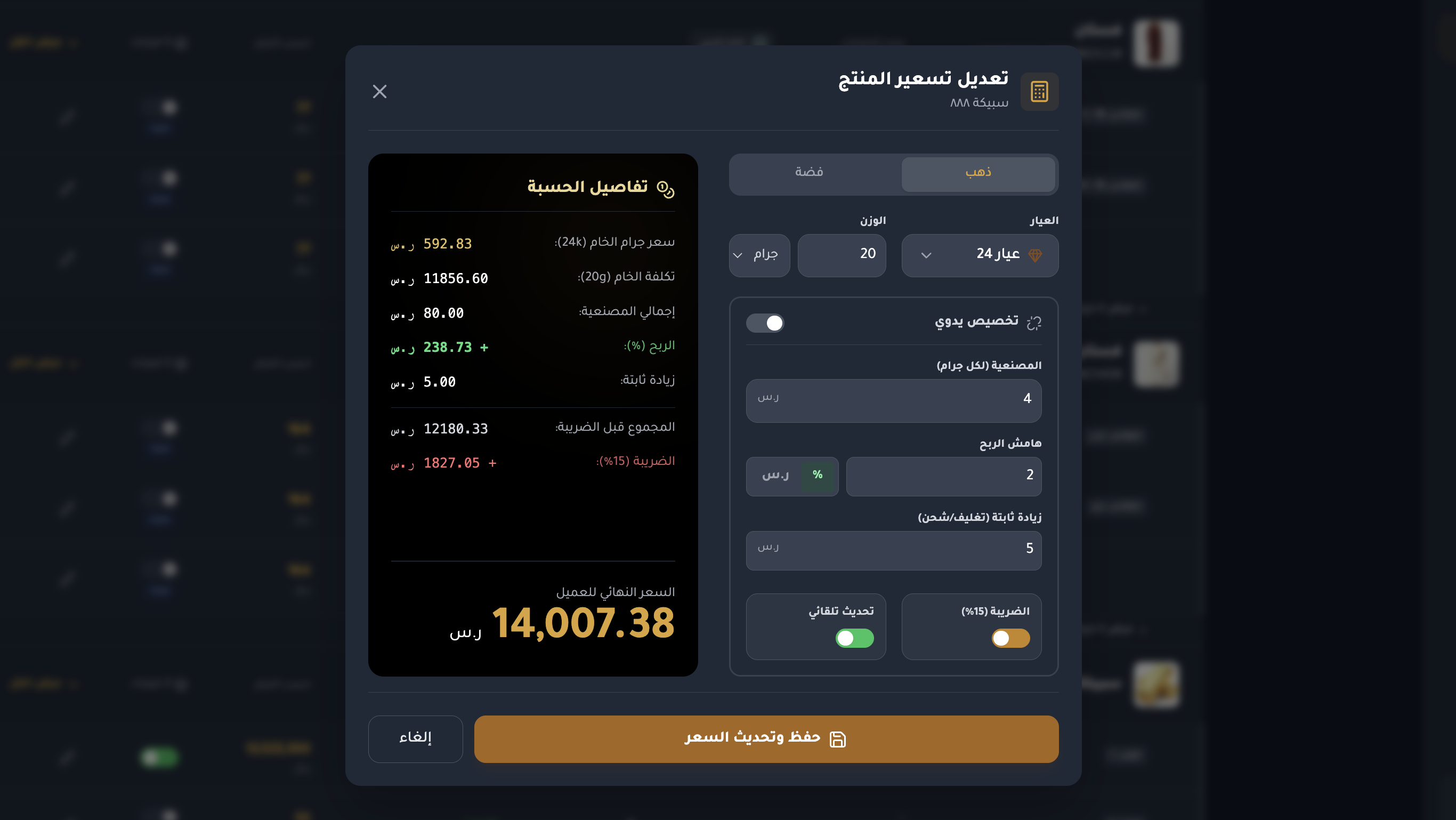 • دعم تعدد عيارات الذهب وتحديث كل صنف وفقًا لسعر عياره بدقة