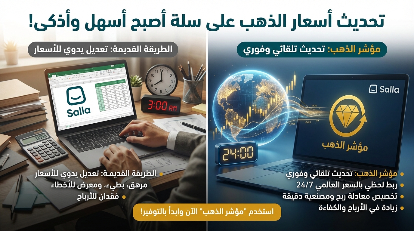 يعتمد مؤشر الذهب على متابعة مستمرة للسعر العالمي للذهب، حيث يقوم تلقائيًا بجلب الأسعار المحدثة وتطبيقها على منتجات متجرك في سلة. يتم هذا التحديث بشكل آلي كل ربع ساعة، ما يعني أن أسعار المنتجات تظل متوافقة مع حركة السوق لحظيًا تقريبًا.