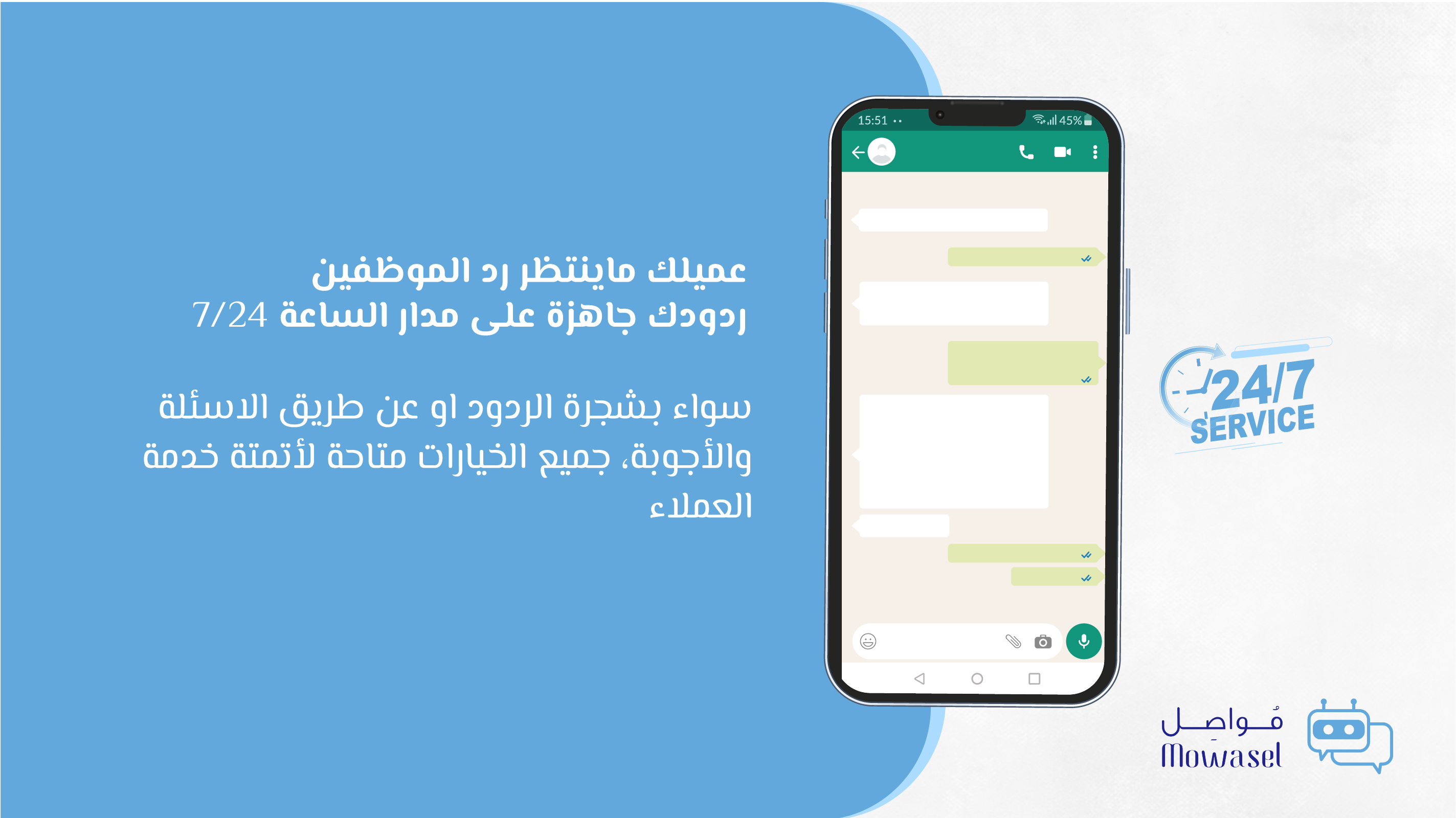 يشمل التطبيق أيضاً إعداد ردود آلية معدة مسبقاً للتعامل مع الاستفسارات الشائعة مما يضمن سرعة الرد وراحة العملاء على مدار الساعة.