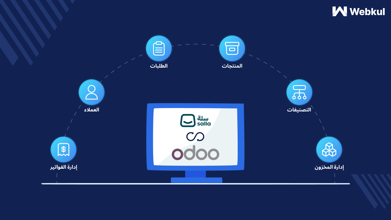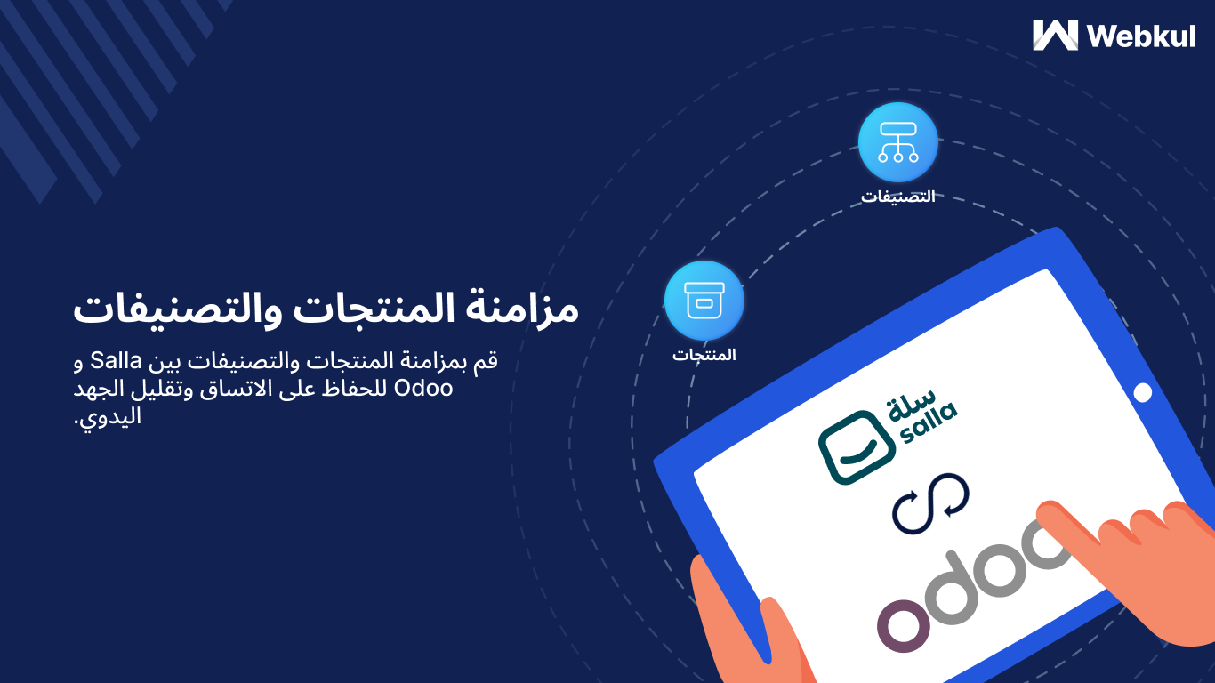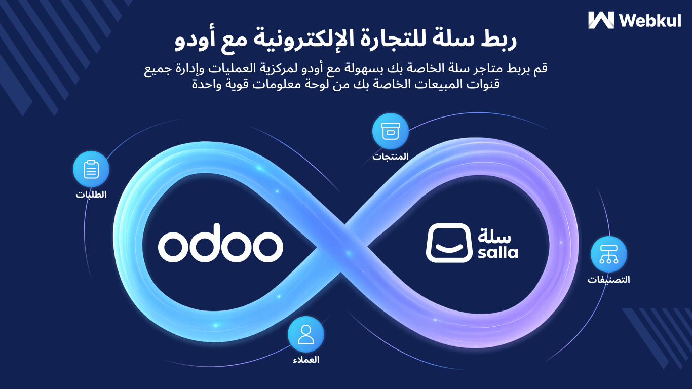يوفر تطبيق موصل Odoo من Webkul للتكامل بين منصة سلة ونظام أودو الأدوات اللازمة لربط وإدارة بيانات المتجر الإلكتروني بشكل متكامل بين البيئتين. يتيح هذا الحل مزامنة المنتجات والطلبات ومعلومات العملاء، مما يسهم في تقليل الأعمال اليدوية وتحسين دقة البيانات بشكل كبير داخل الأعمال التي تعتمد على سلة لإدارة المتجر وأودو لإدارة المحاسبة والعمليات الداخلية.