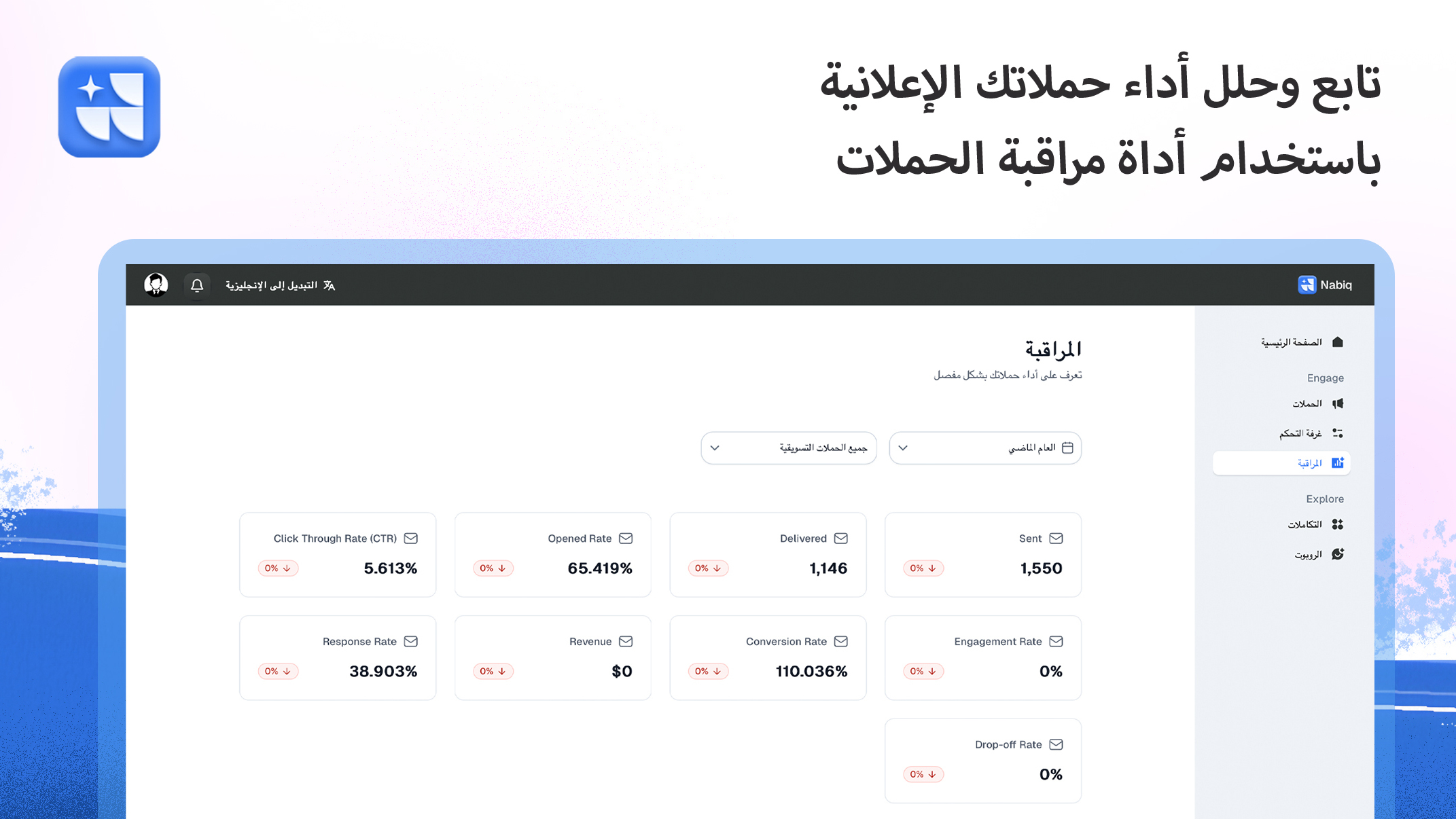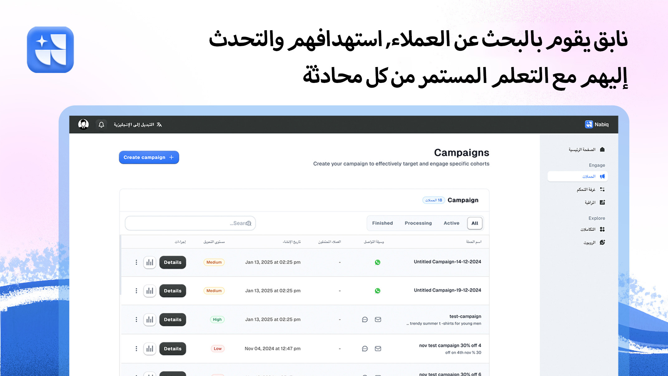 باستخدام هذه البيانات، ينشئ التطبيق حملات تسويقية ورسائل مخصصة تُرسل تلقائيًا عبر قنوات الاتصال التي يفضلها العميل كواتساب أو البريد الإلكتروني. يتابع نابق أداء هذه الحملات لحظيًا ويعرض تقارير تفصيلية تساعدك في تحسين الاستهداف واتخاذ قرارات تسويقية فعّالة.