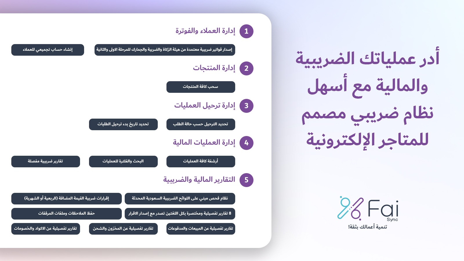 يوفر “نظام في” بيئة مرنة ومترابطة تربط جميع بيانات متجرك في سلة مع الأنظمة المحاسبية، مما يقلل الأعمال اليدوية ويضمن الدقة والسرعة. يوفر النظام منصة موحدة تدمج جميع الإجراءات المالية والضريبية في واجهة بسيطة وسهلة الاستخدام.