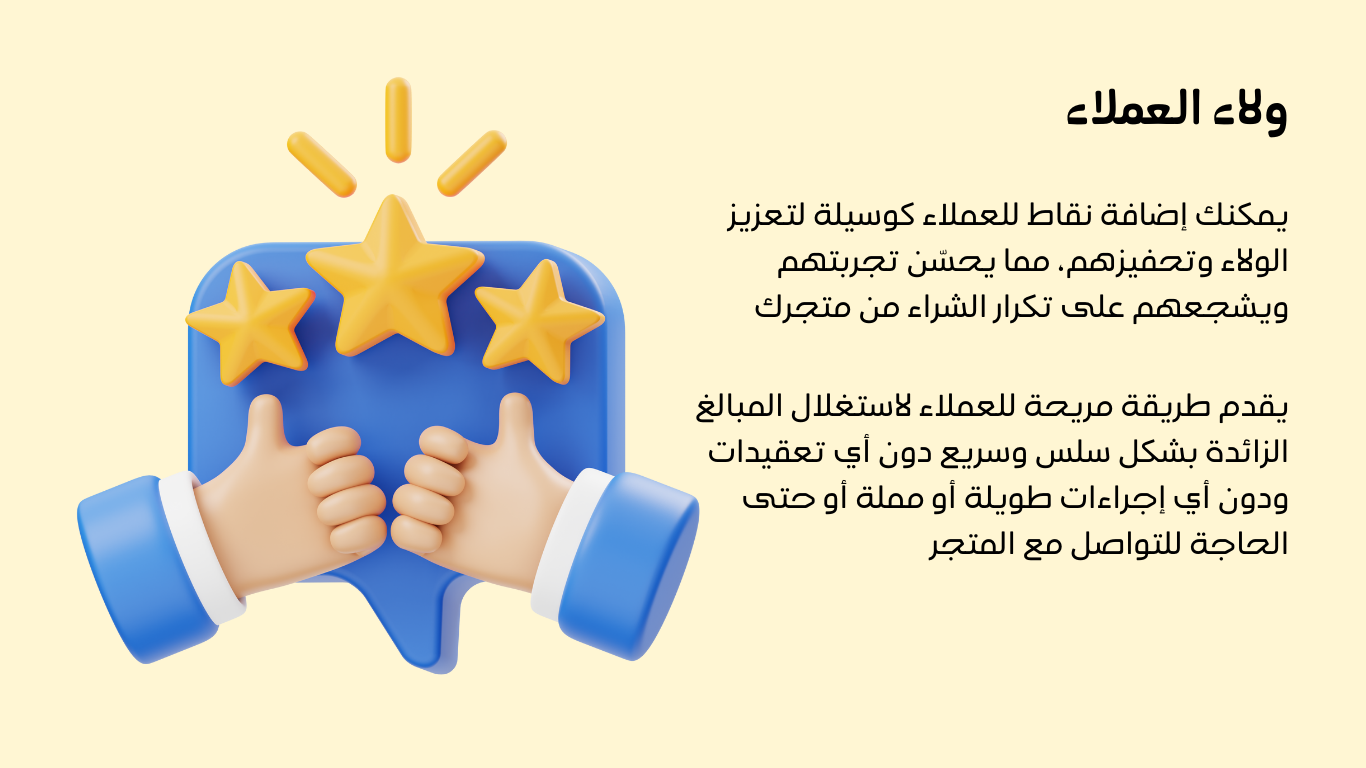 علاوة على ذلك، يعد خيارًا مثاليًا للمتاجر التي تستهدف زيادة التعلق بعلامتها التجارية عبر نظام مكافآت واضح، بسيط، وسهل في التحكم لكل من التاجر والعميل، ما يدعم مزيدًا من النمو والانتشار للمتجر.